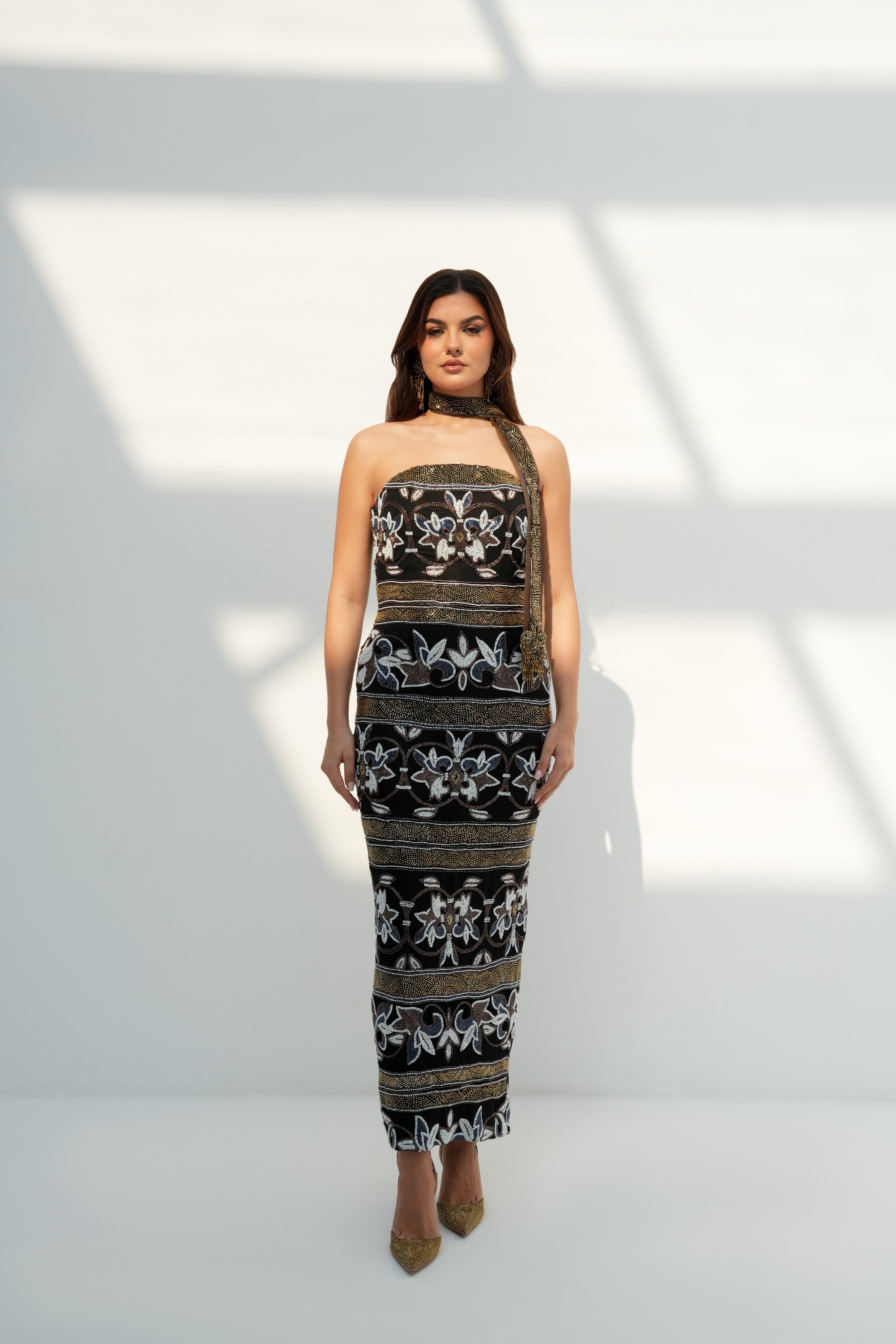 Brown column banded with gold-and-ivory florals and a trailing scarf tie; small glows among vines guide the silhouette.