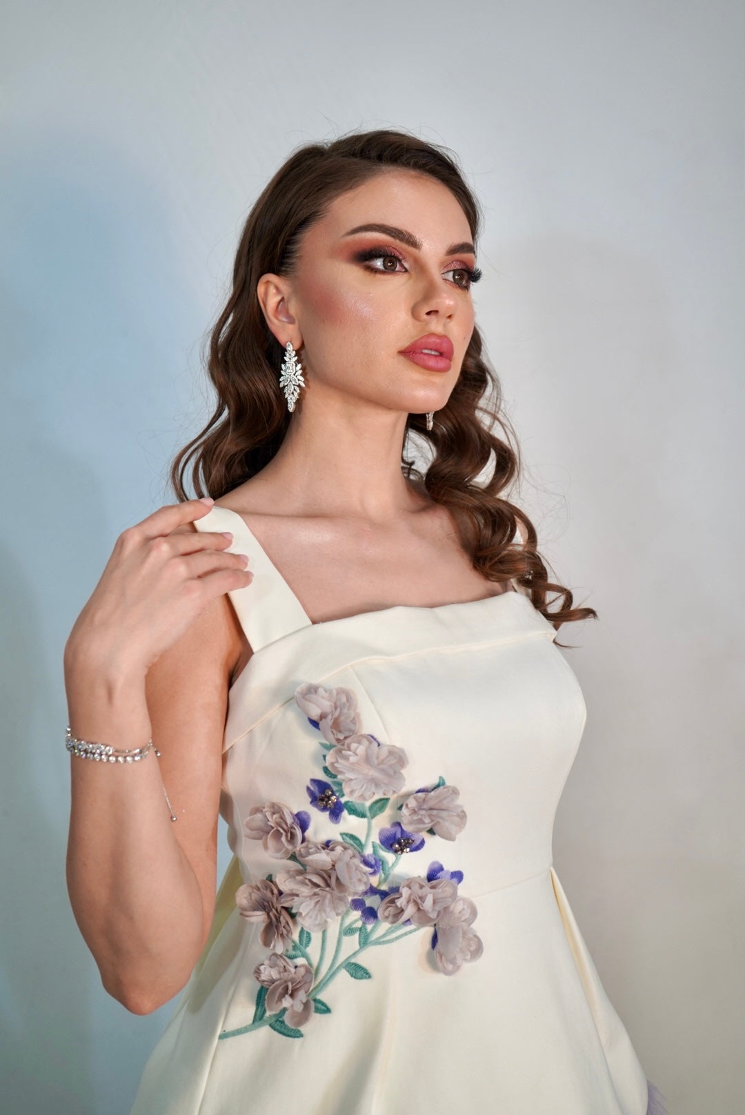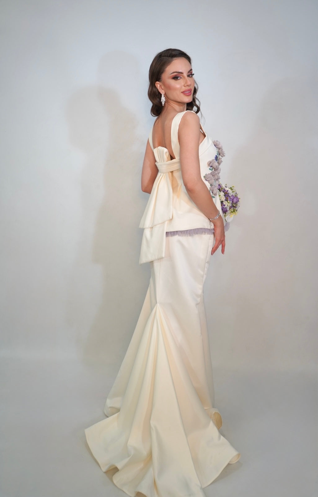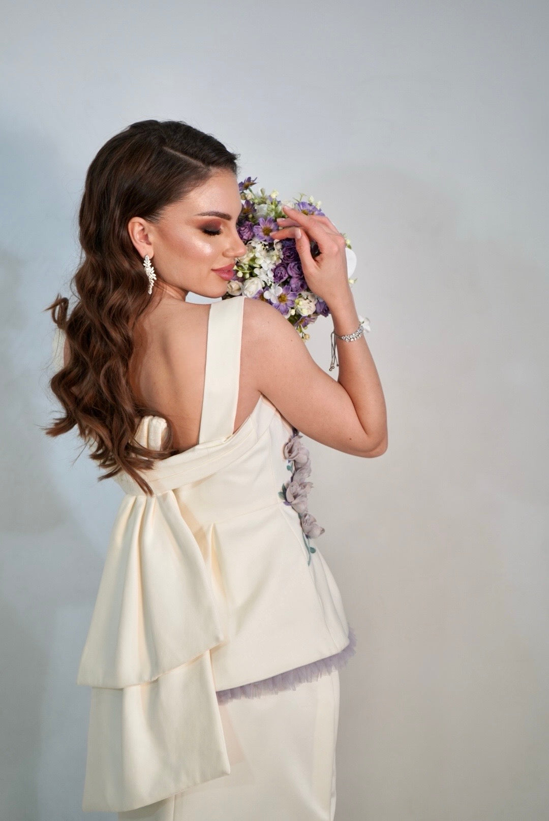 A two-piece white gown that elevates your look with a hint of lavender floral and a wonderful detailed bow in the back.