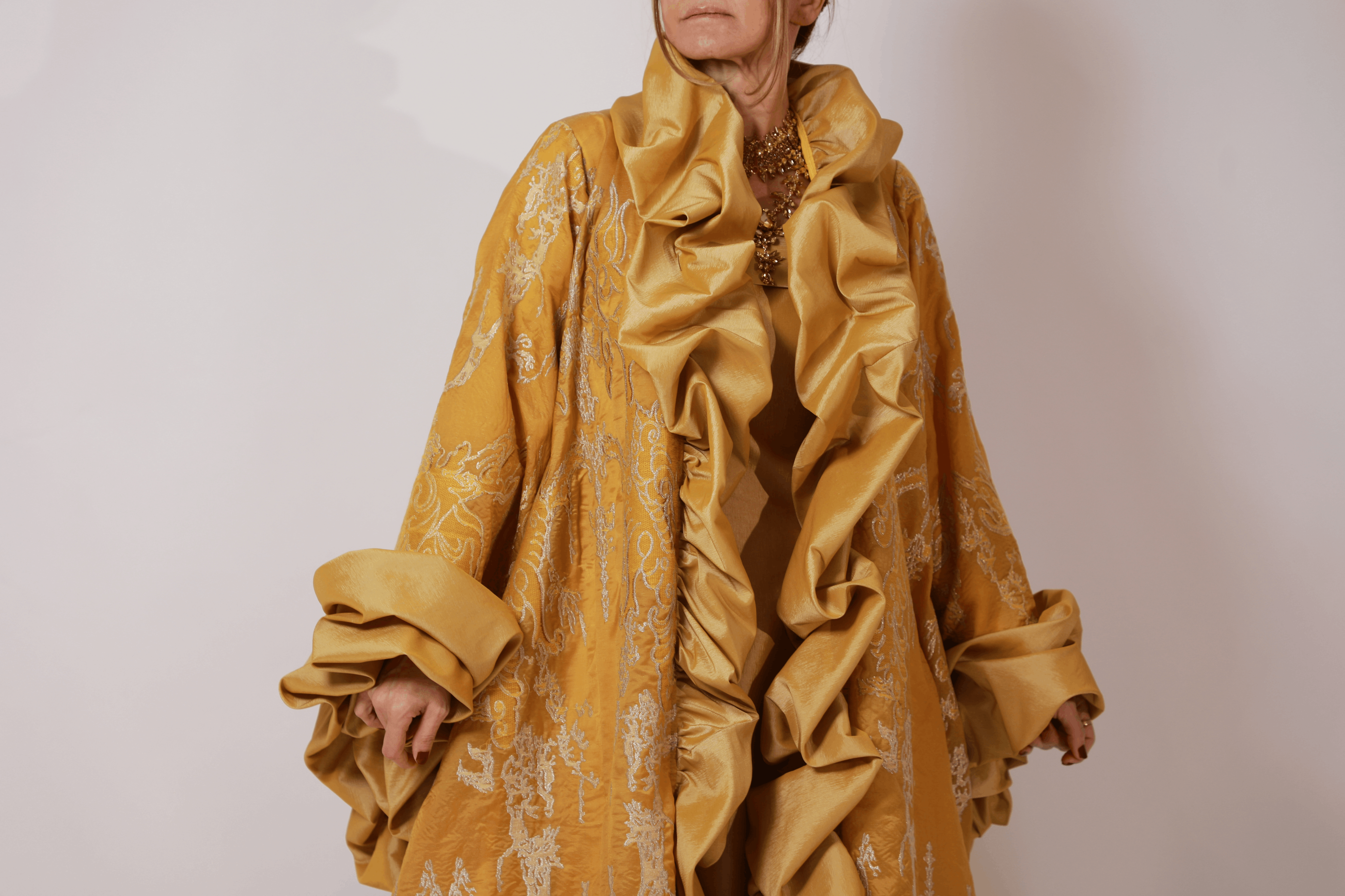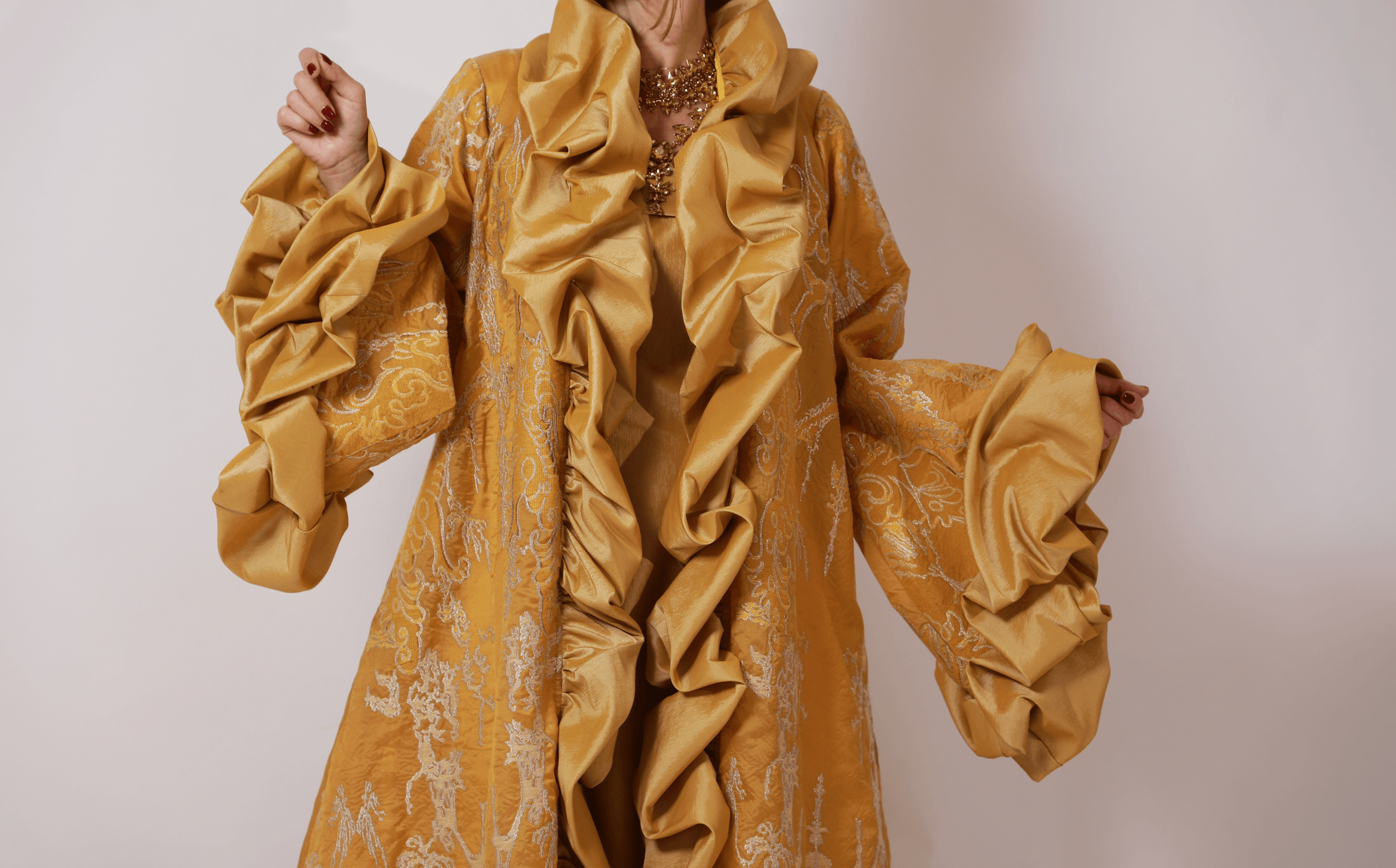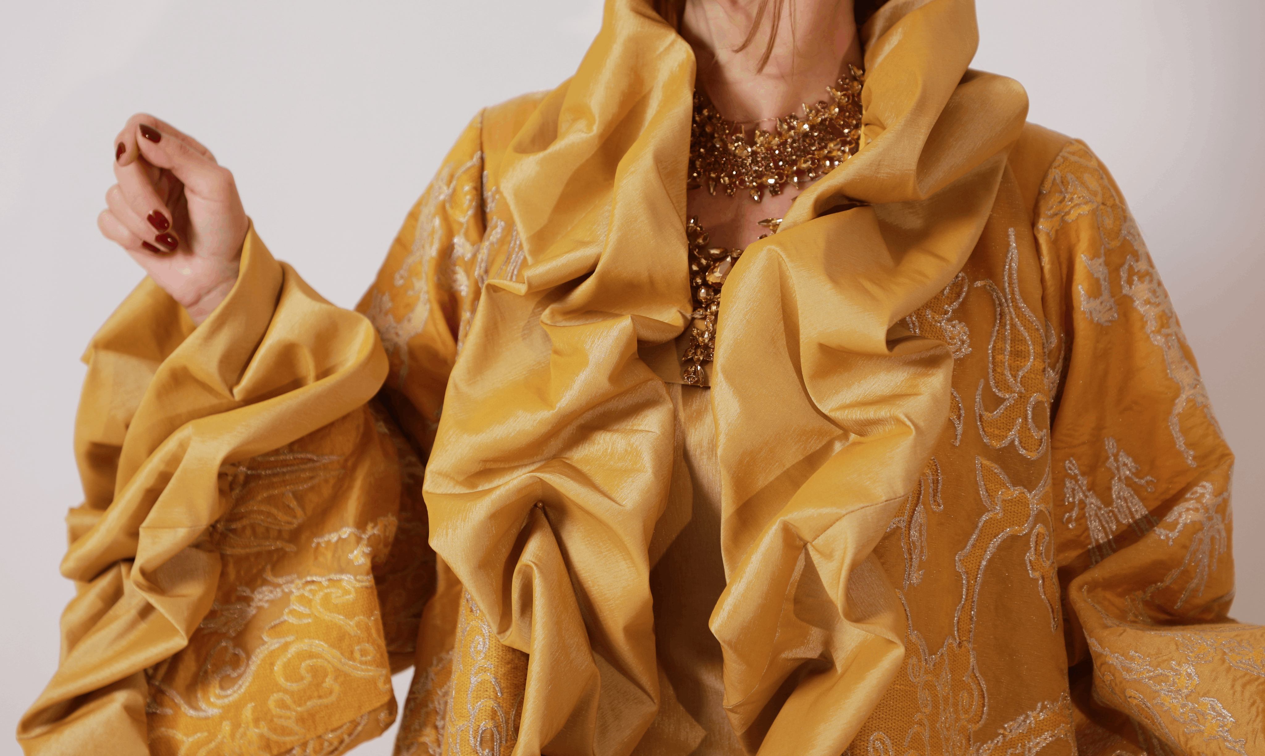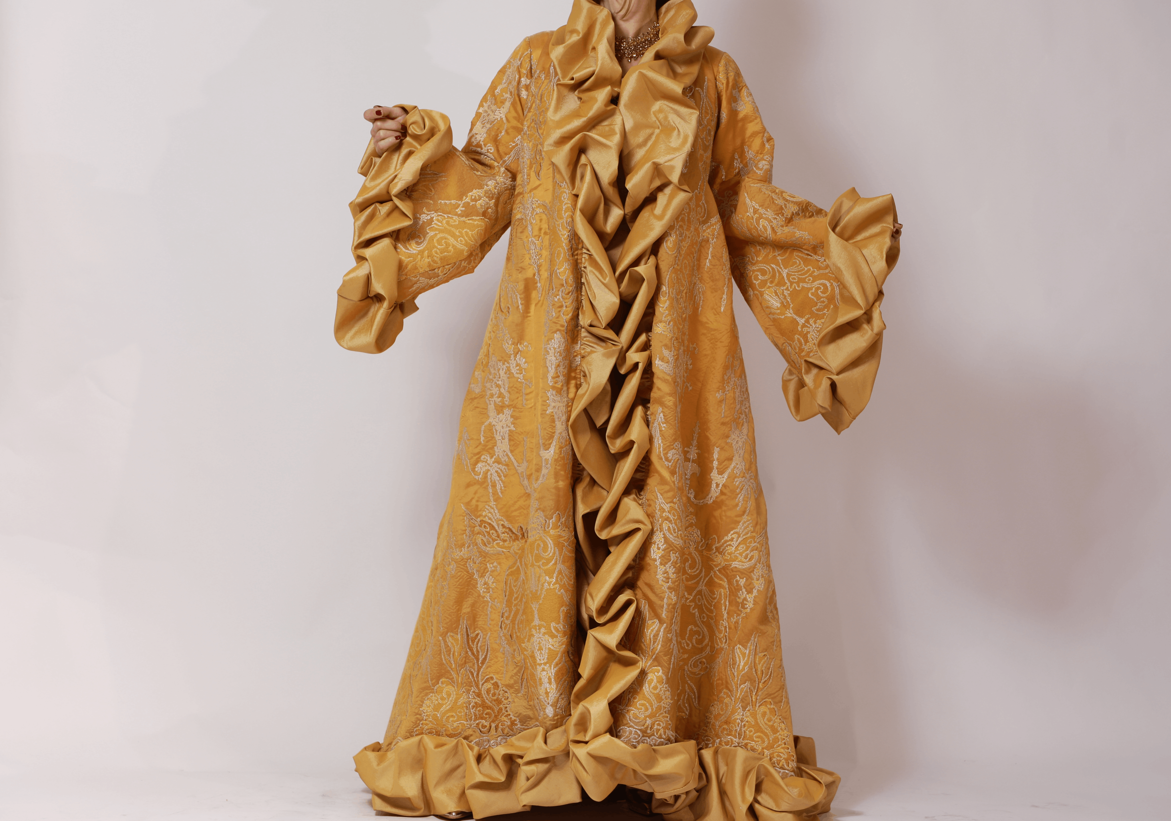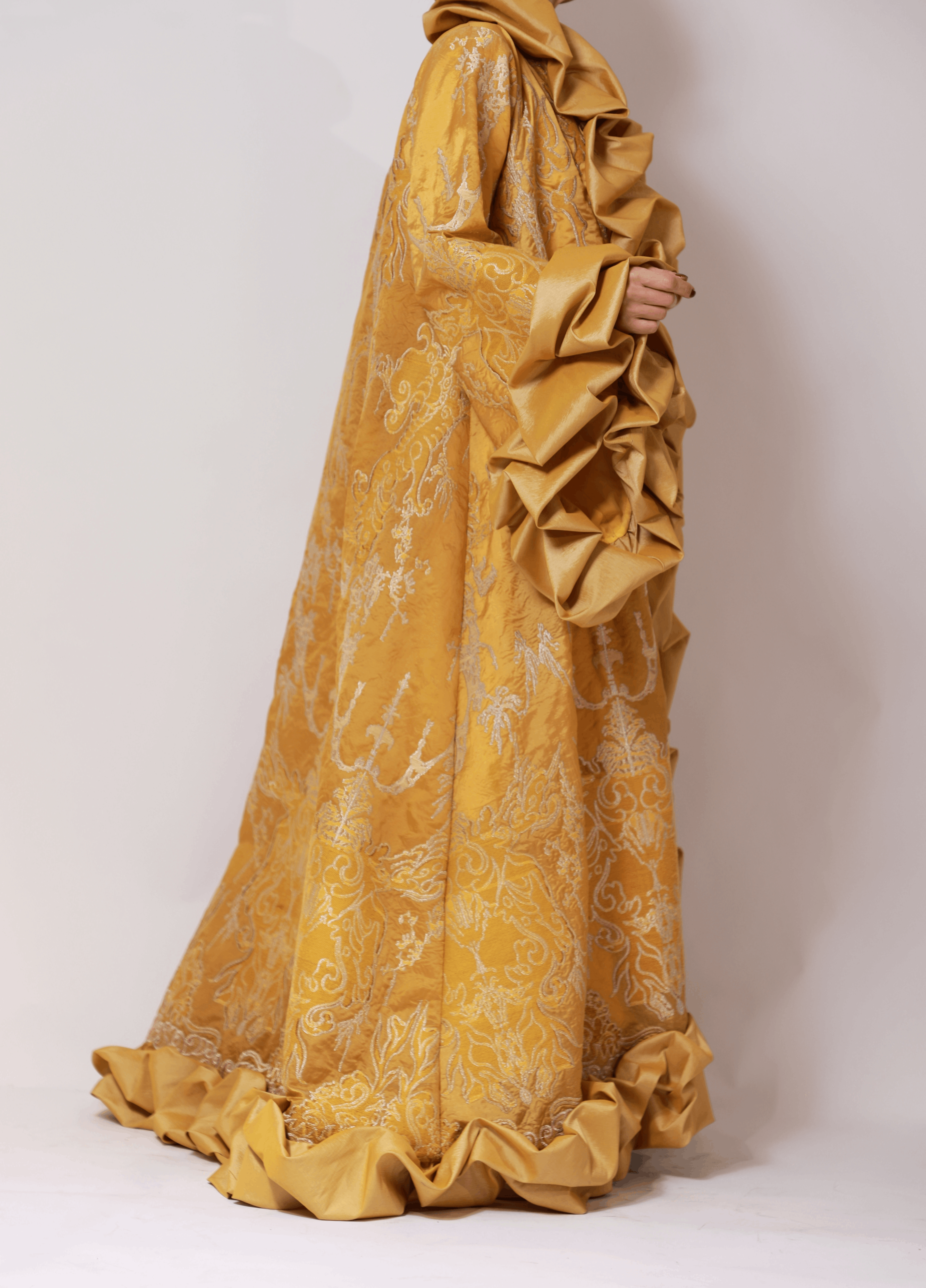 The perfect way to walk into ramadan is with a fully mustard embeleshed abaya and cape.