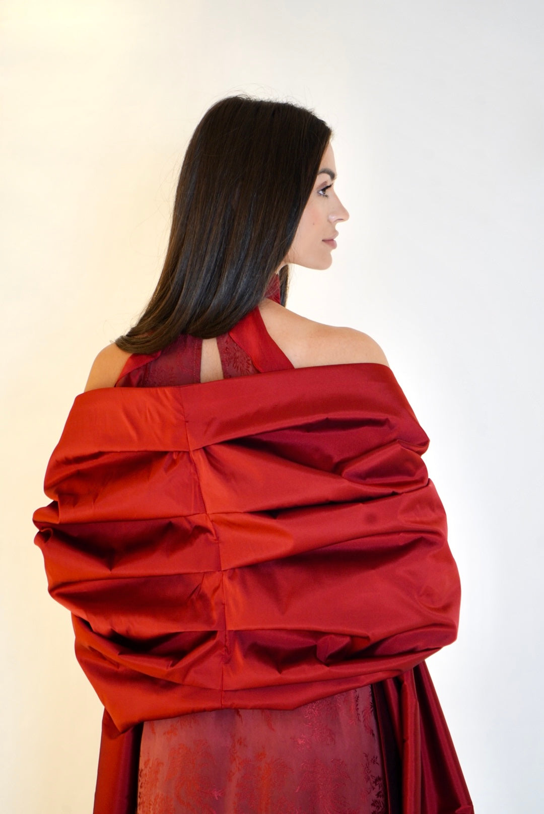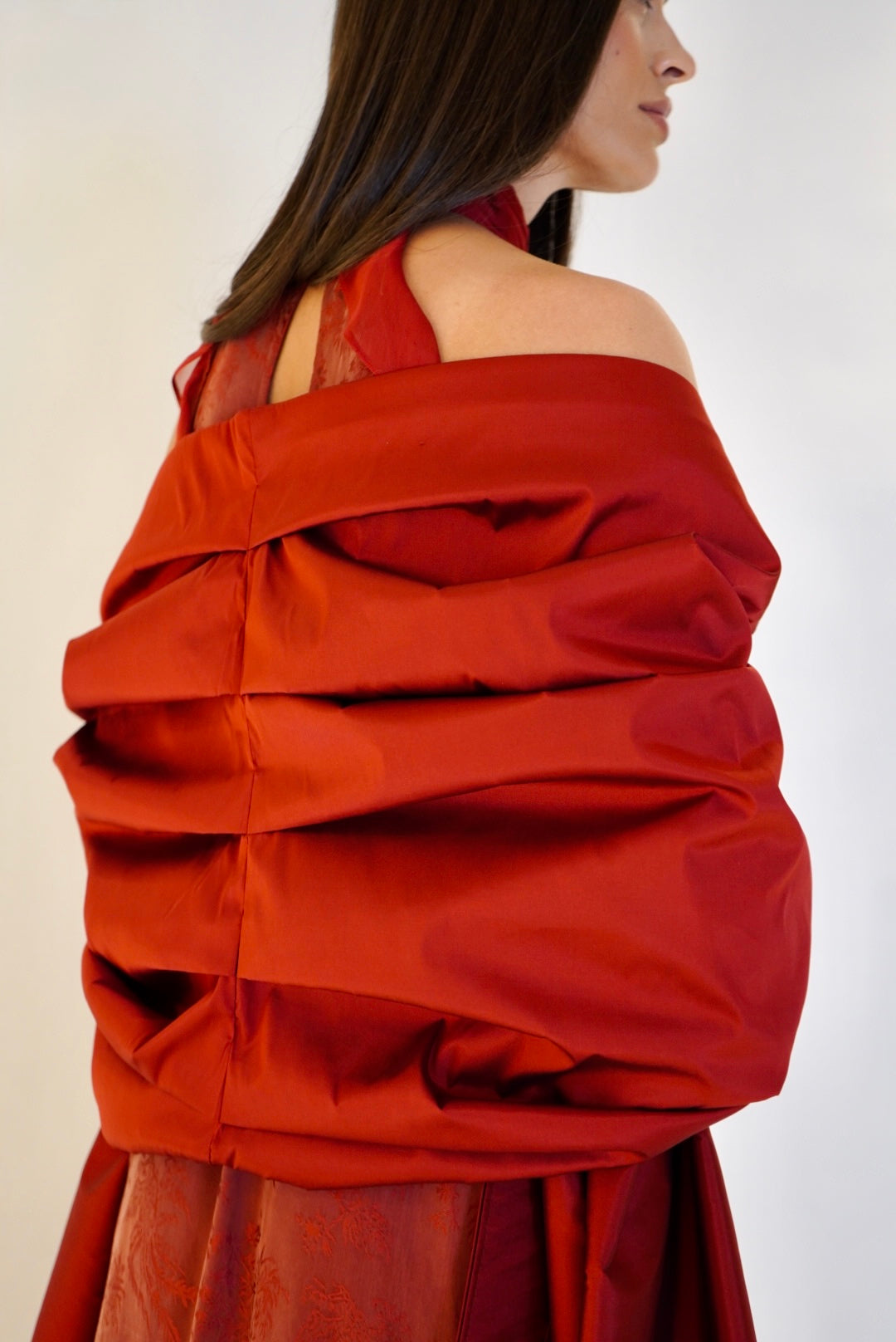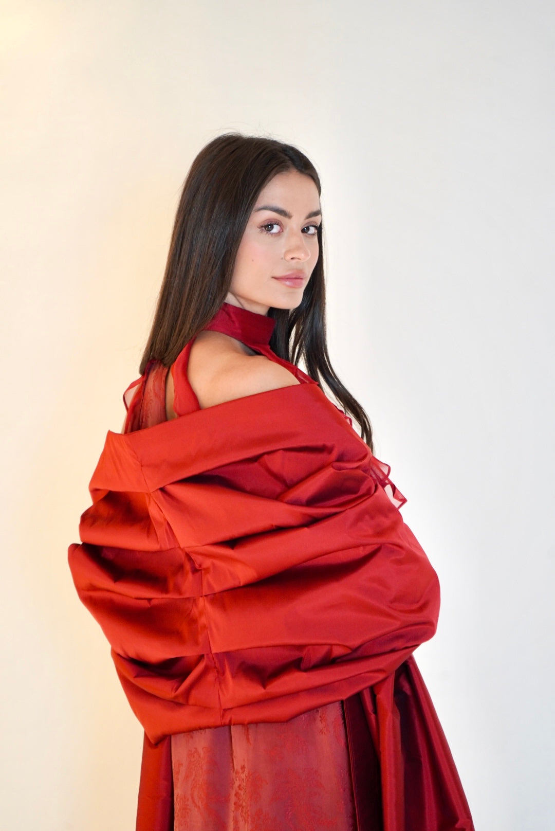 A bold, structured piece with dramatic red tones, highlighted by sharp tailoring and a sleek silhouette.