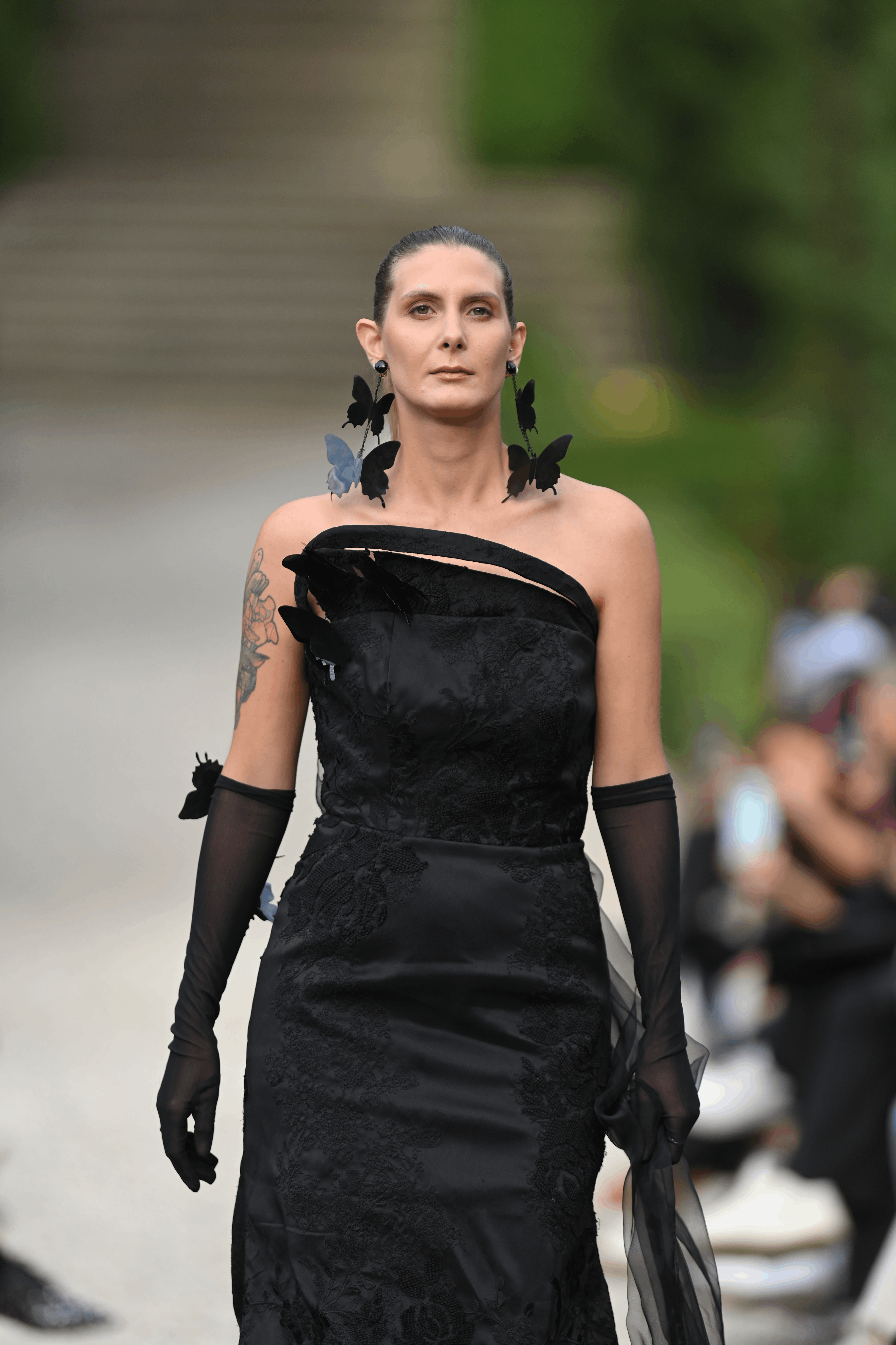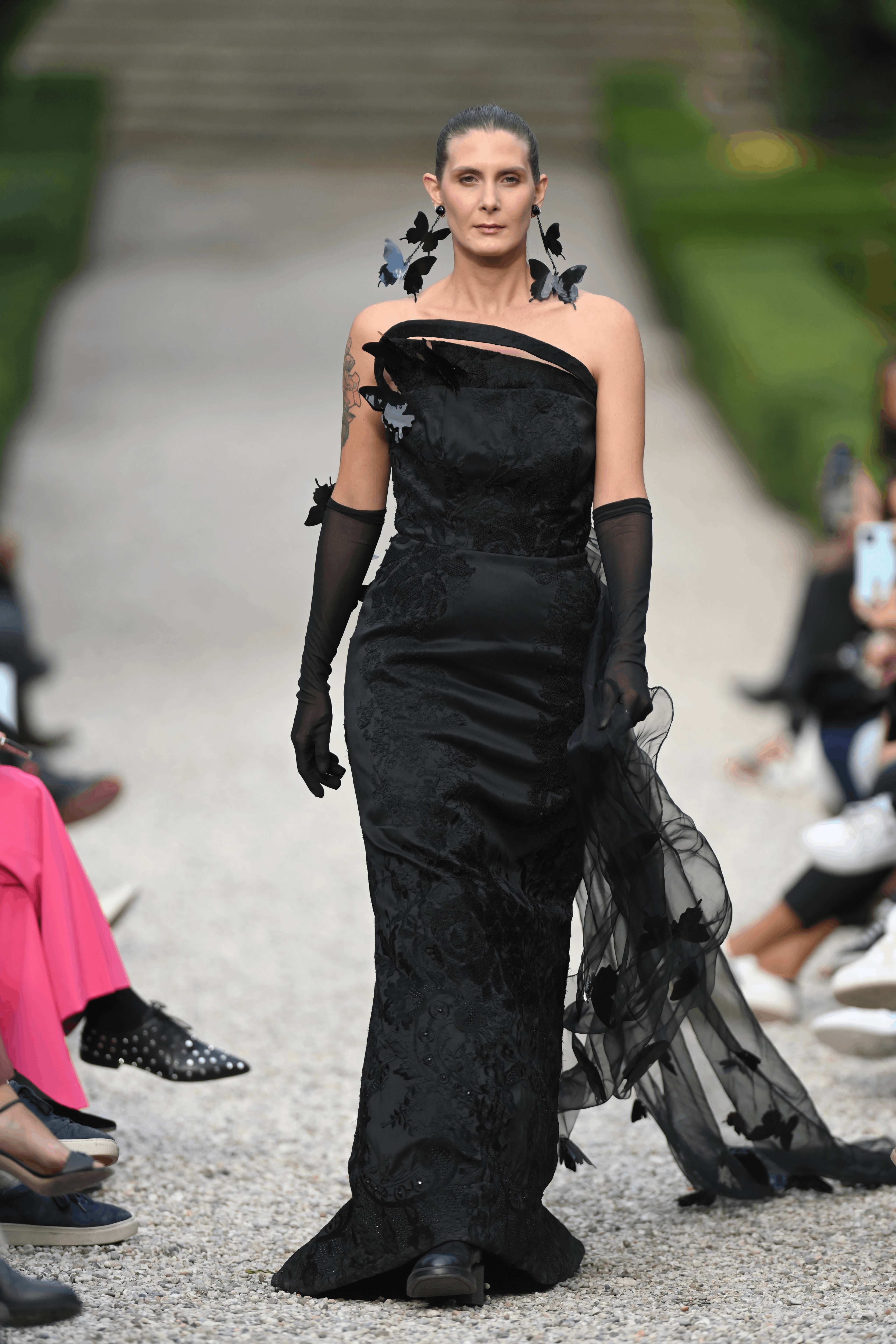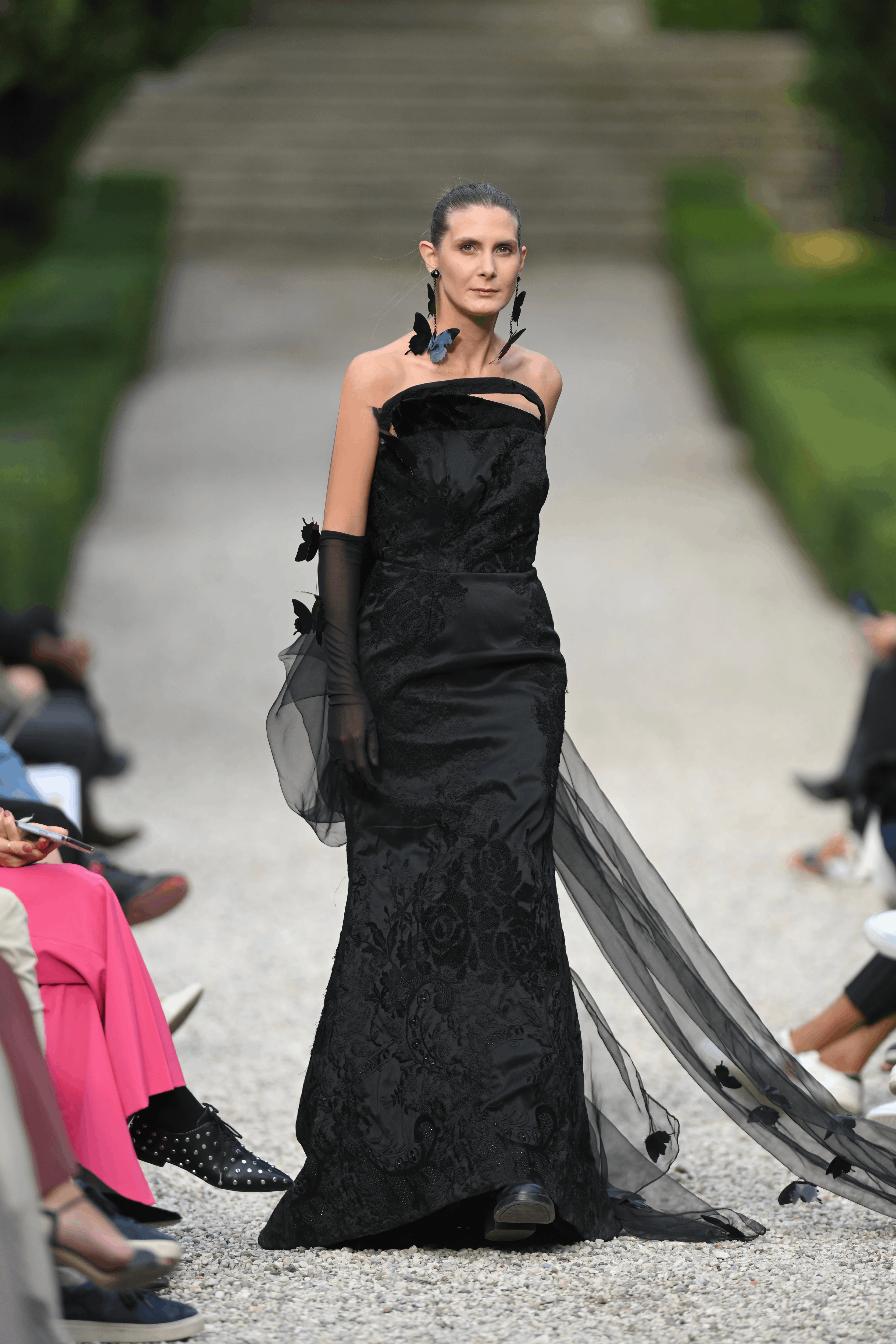 A memorable black dress with butterfly details and a long draping tail.