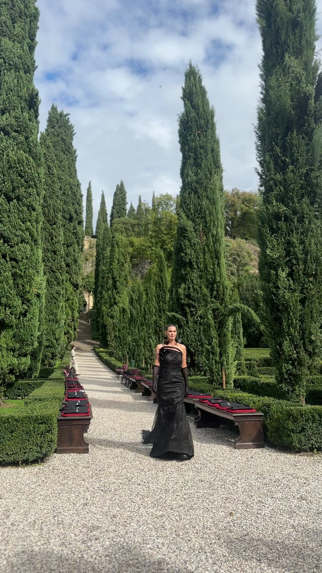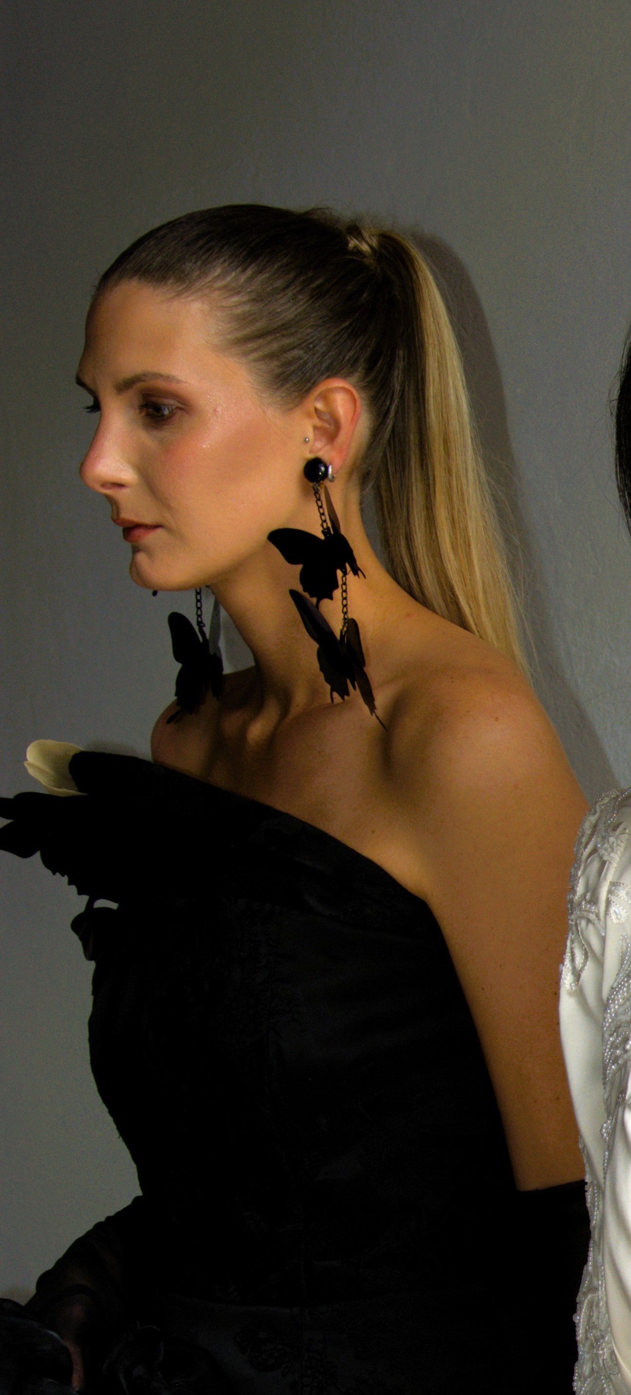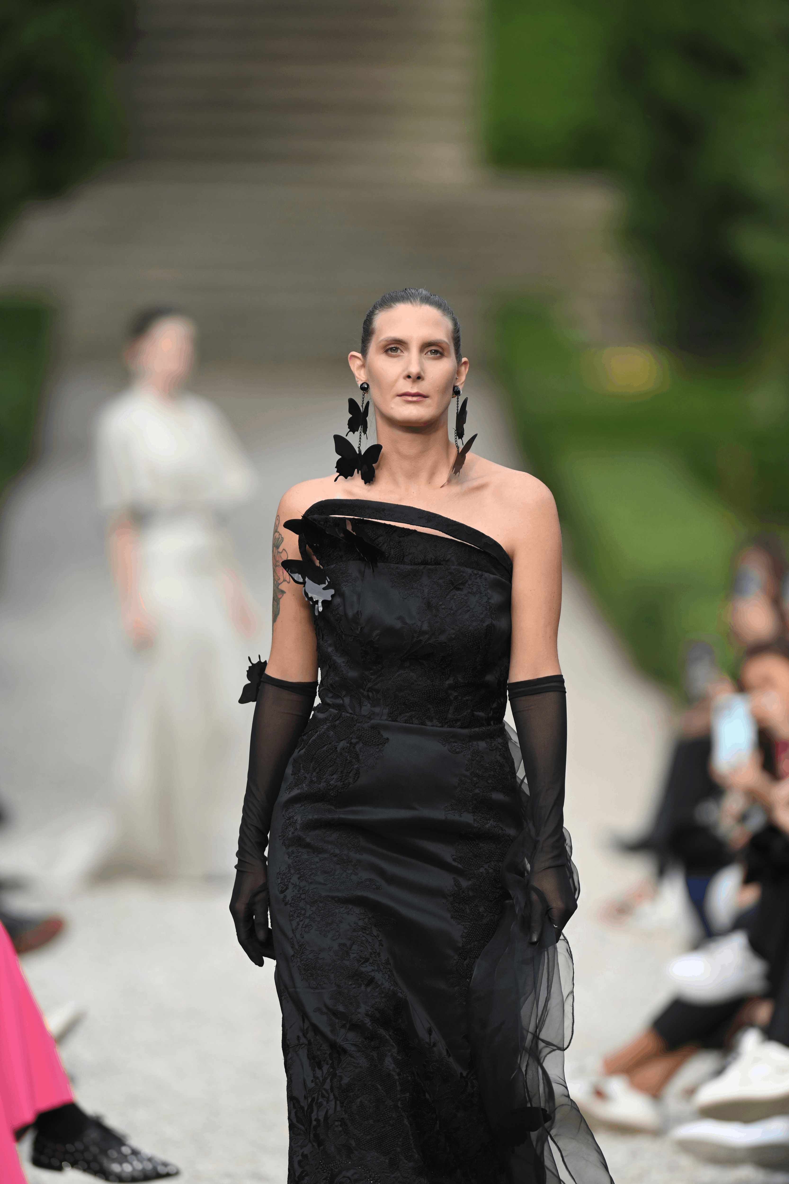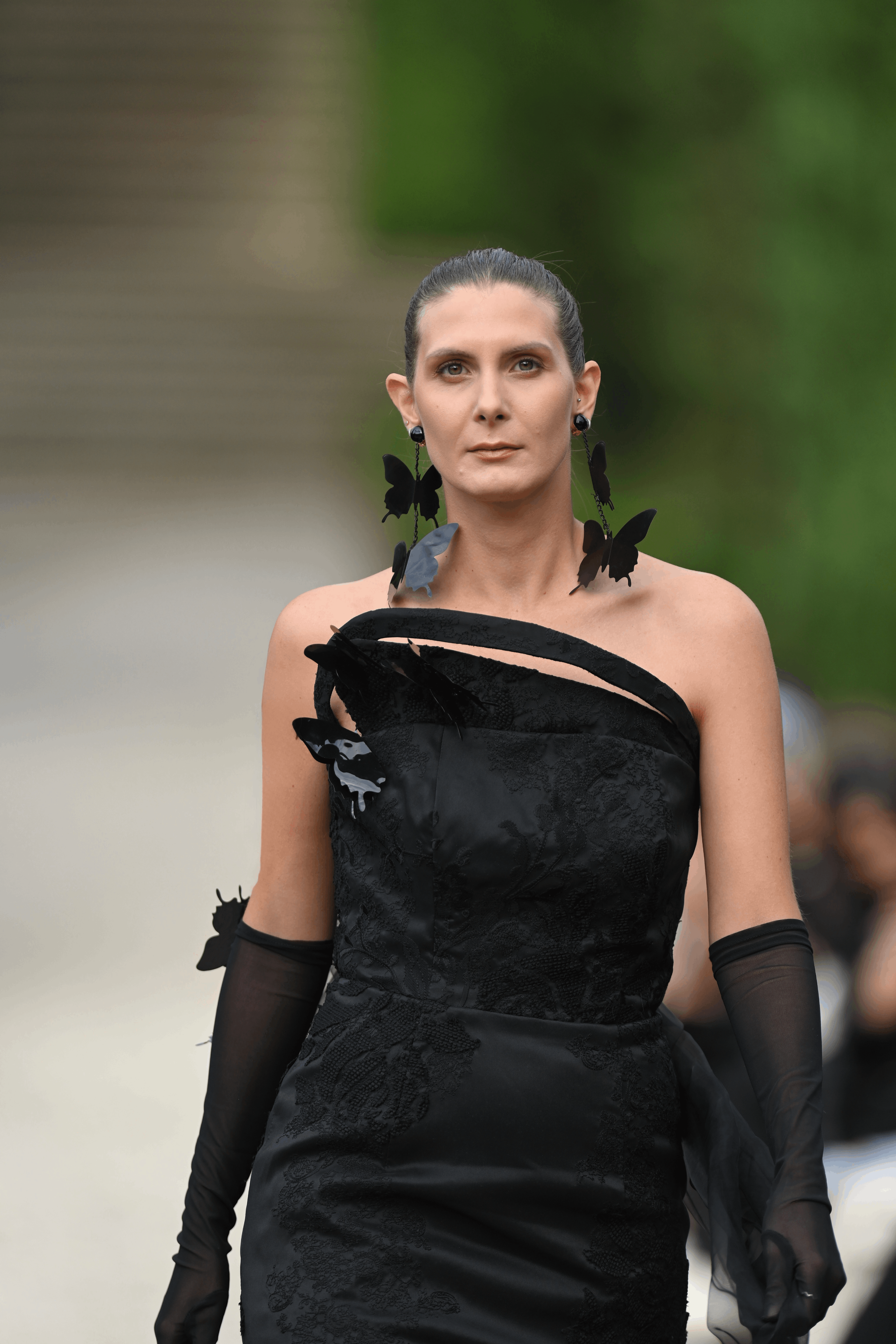 A memorable black dress with butterfly details and a long draping tail.