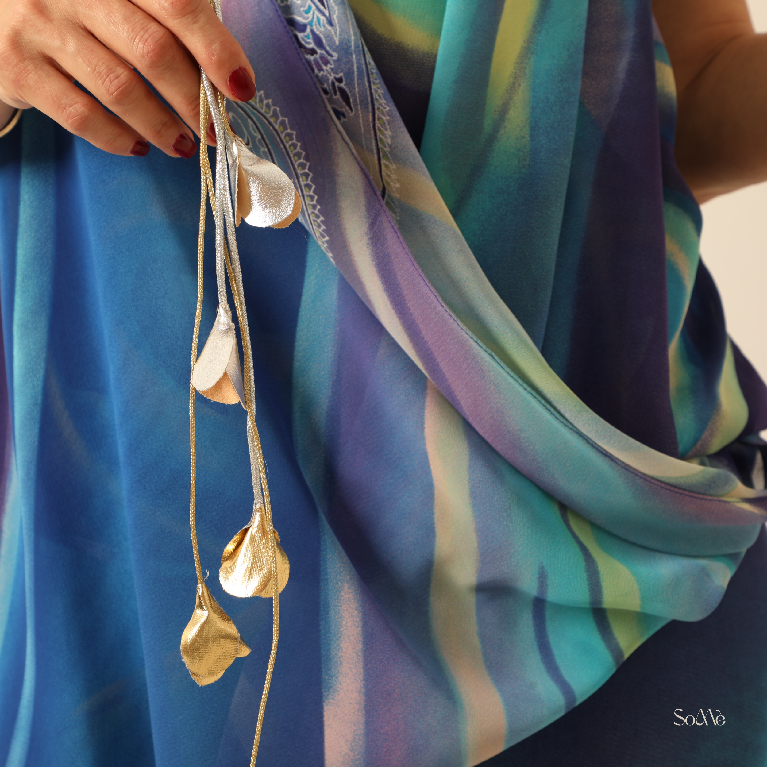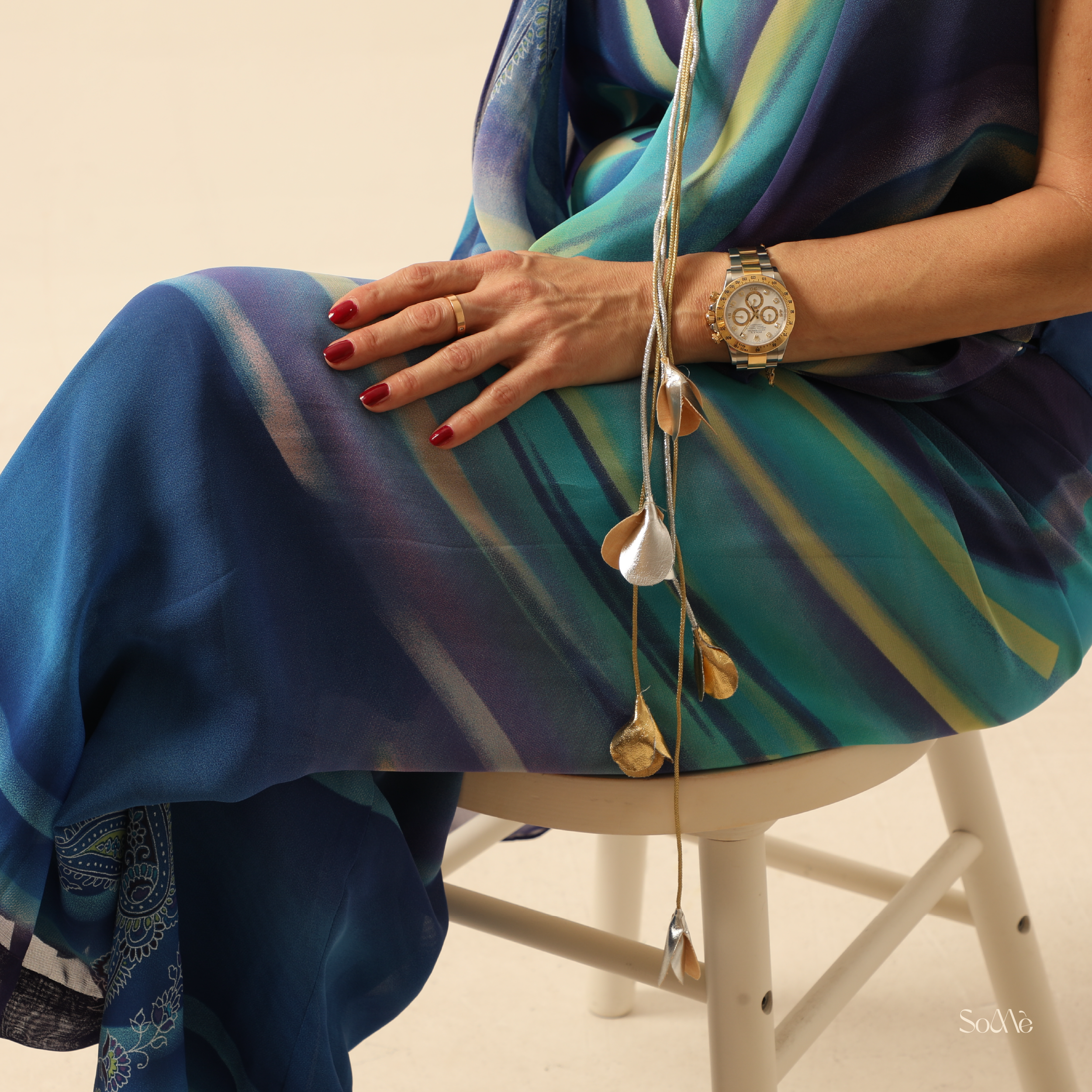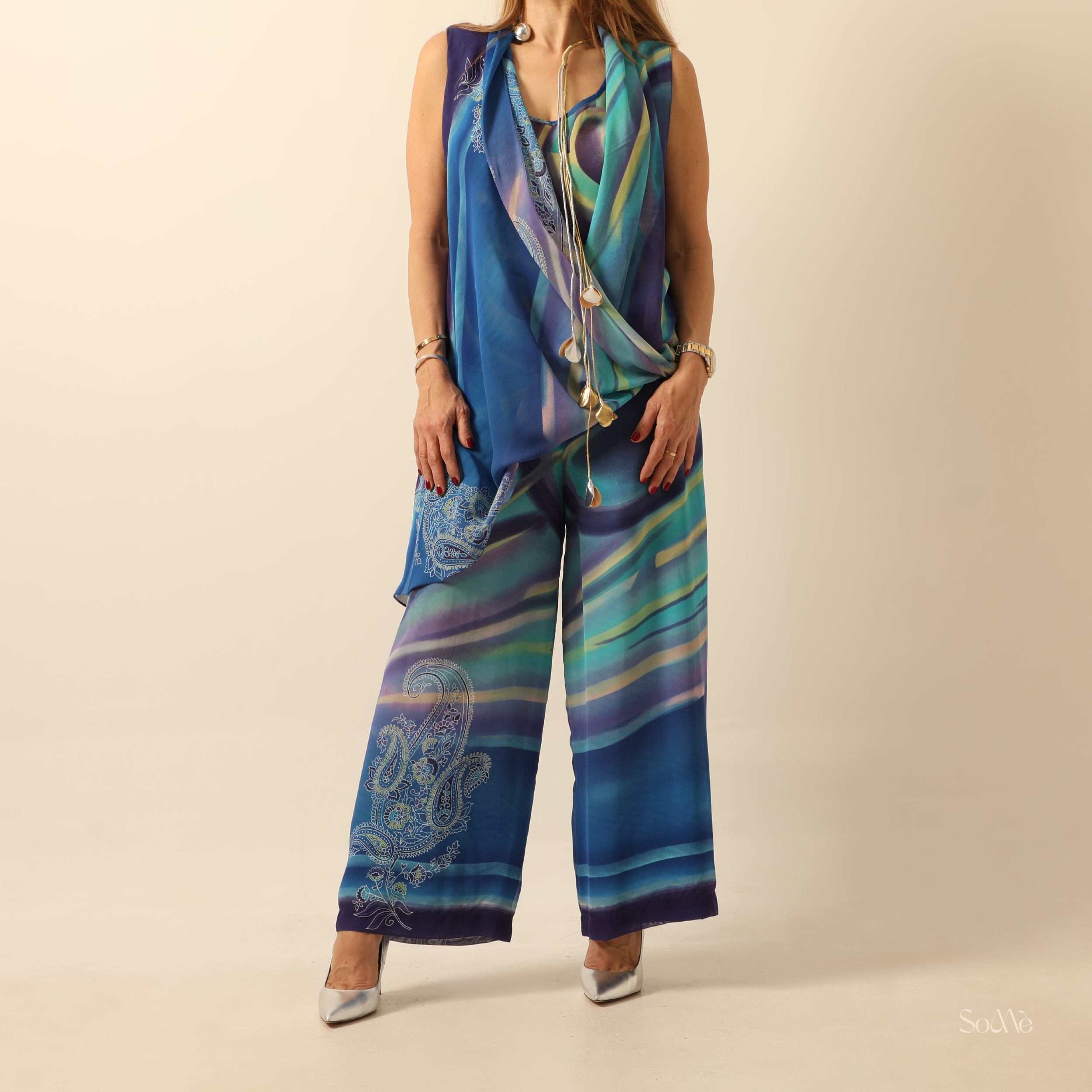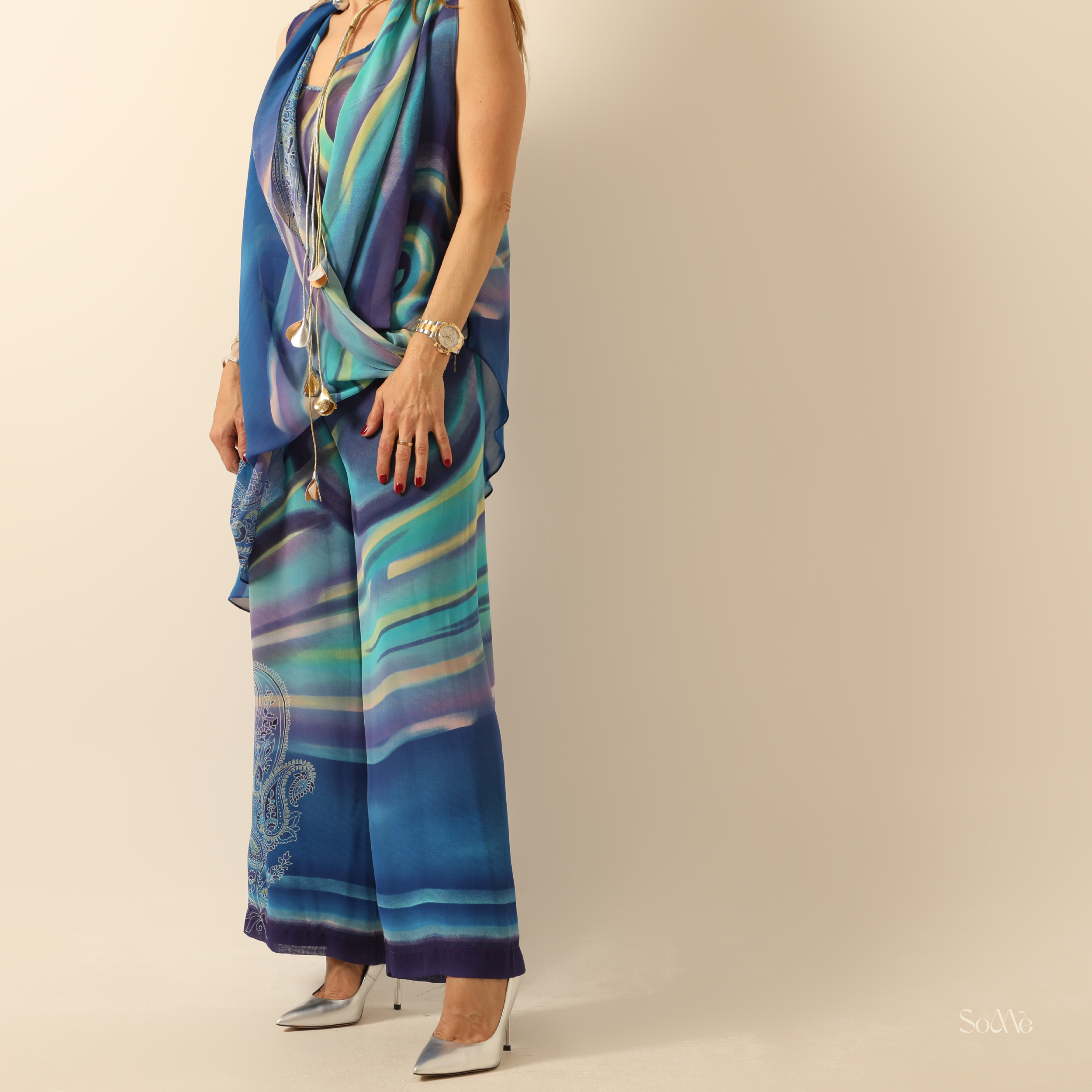 A gracious blue print two-piece made of german crepe, meant to flow subtly like the ocean.