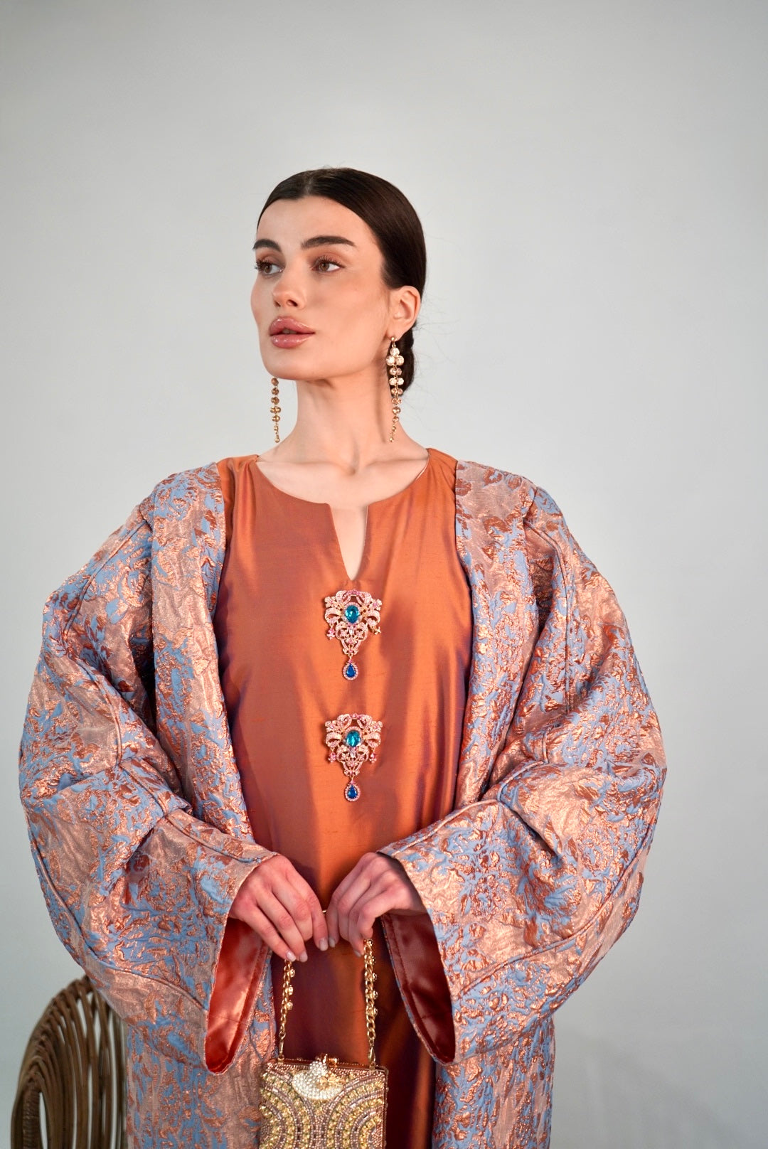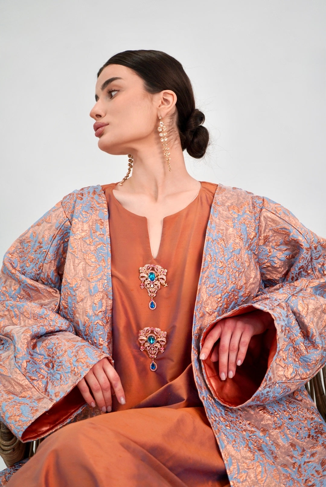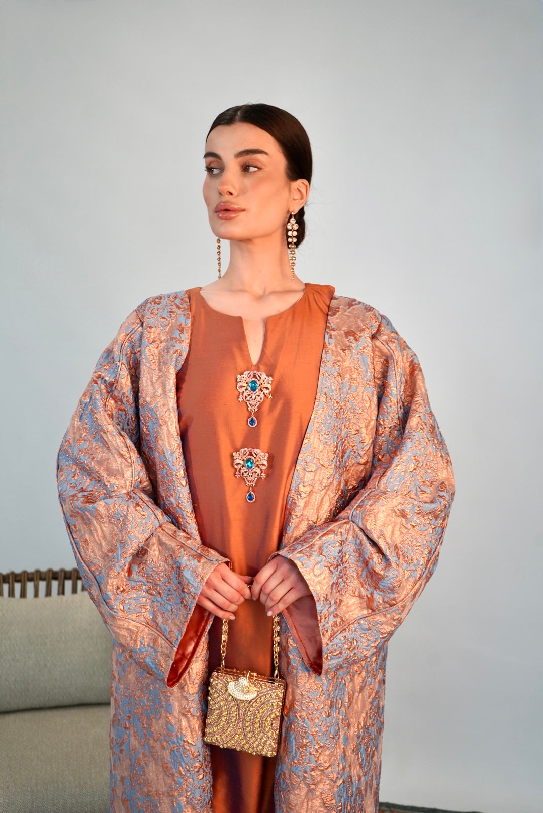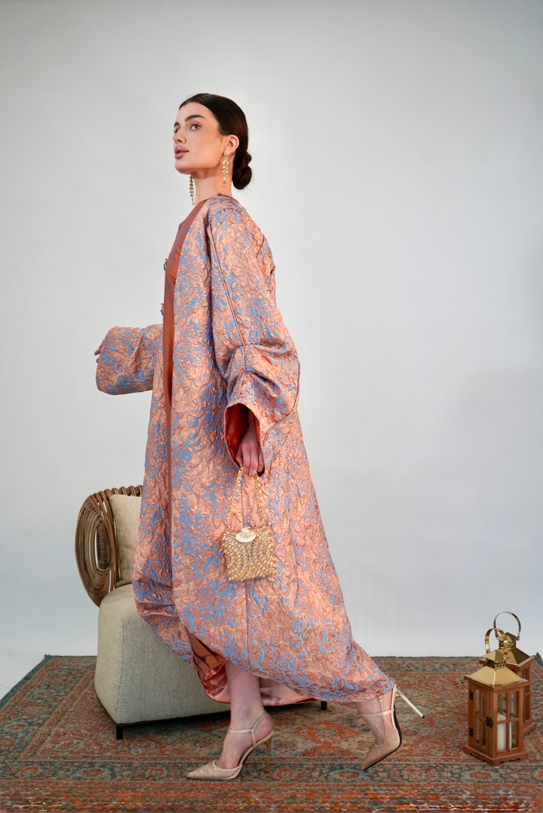 Rose‑peach jacquard kimono over rust—soft shimmer like lanterns waking at sunset.