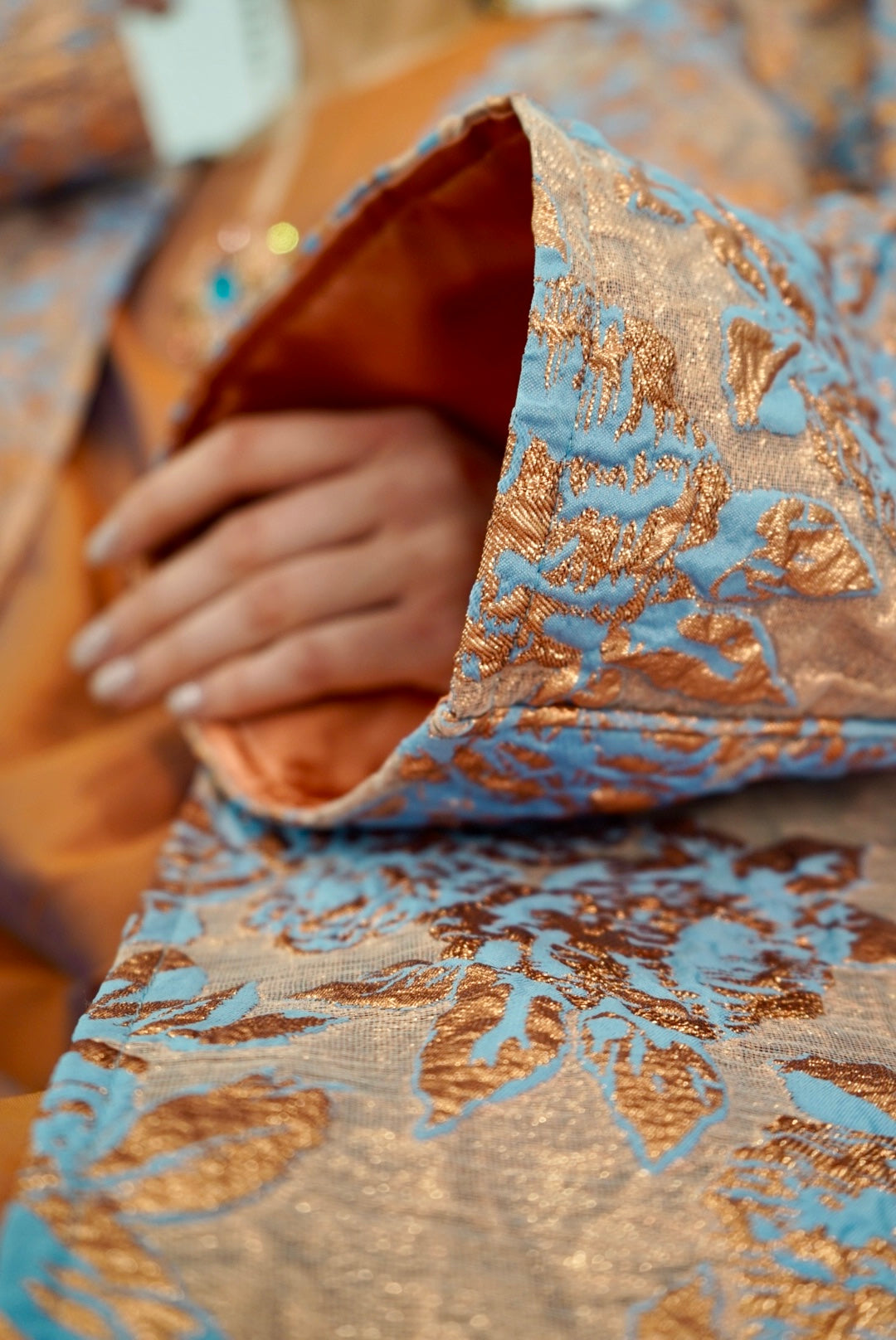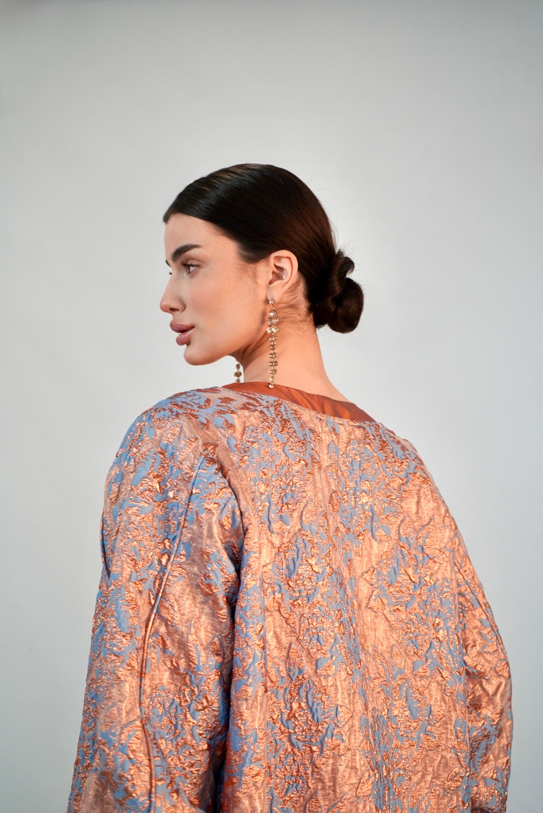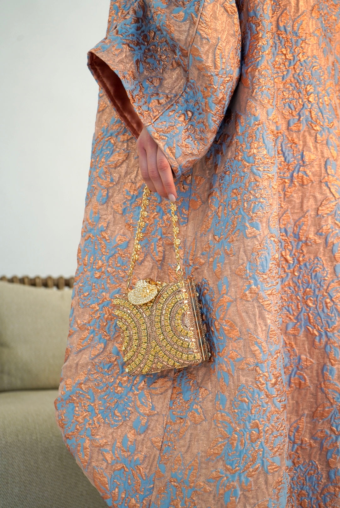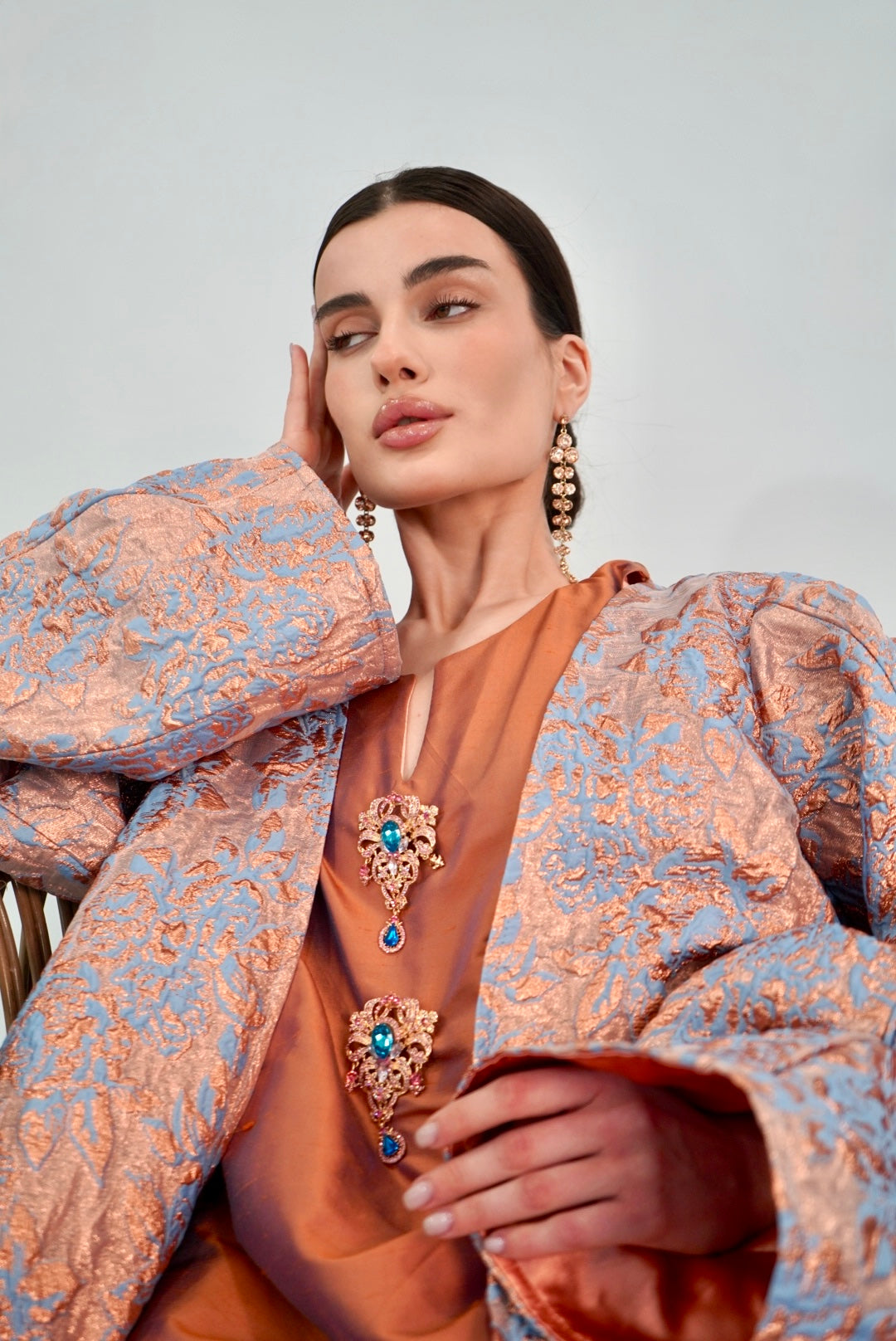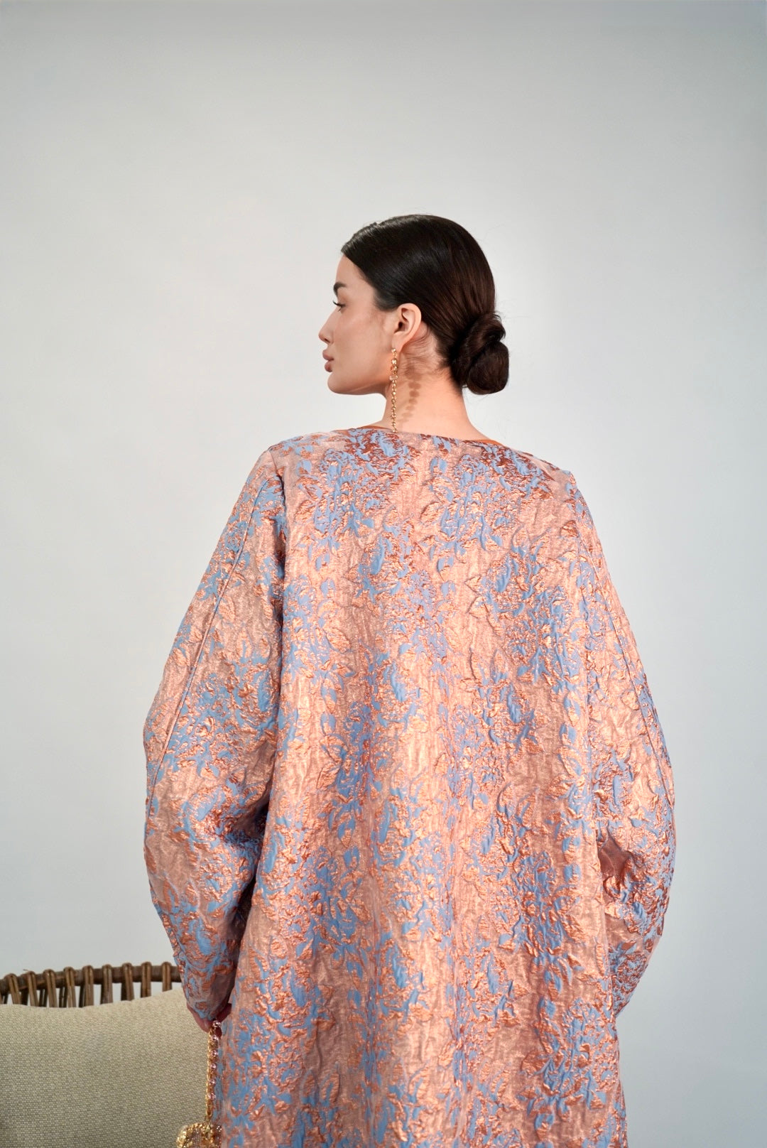 Rose‑peach jacquard kimono over rust—soft shimmer like lanterns waking at sunset.