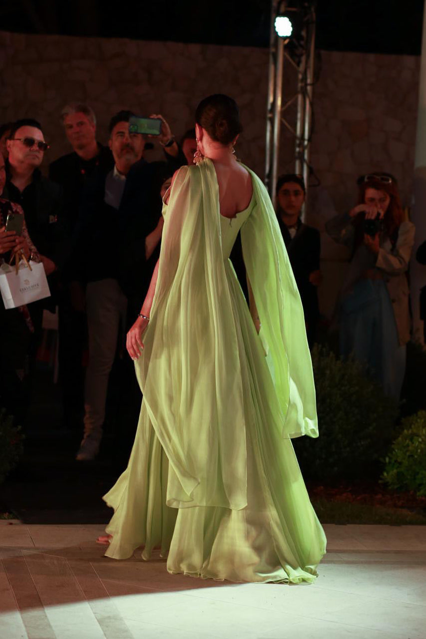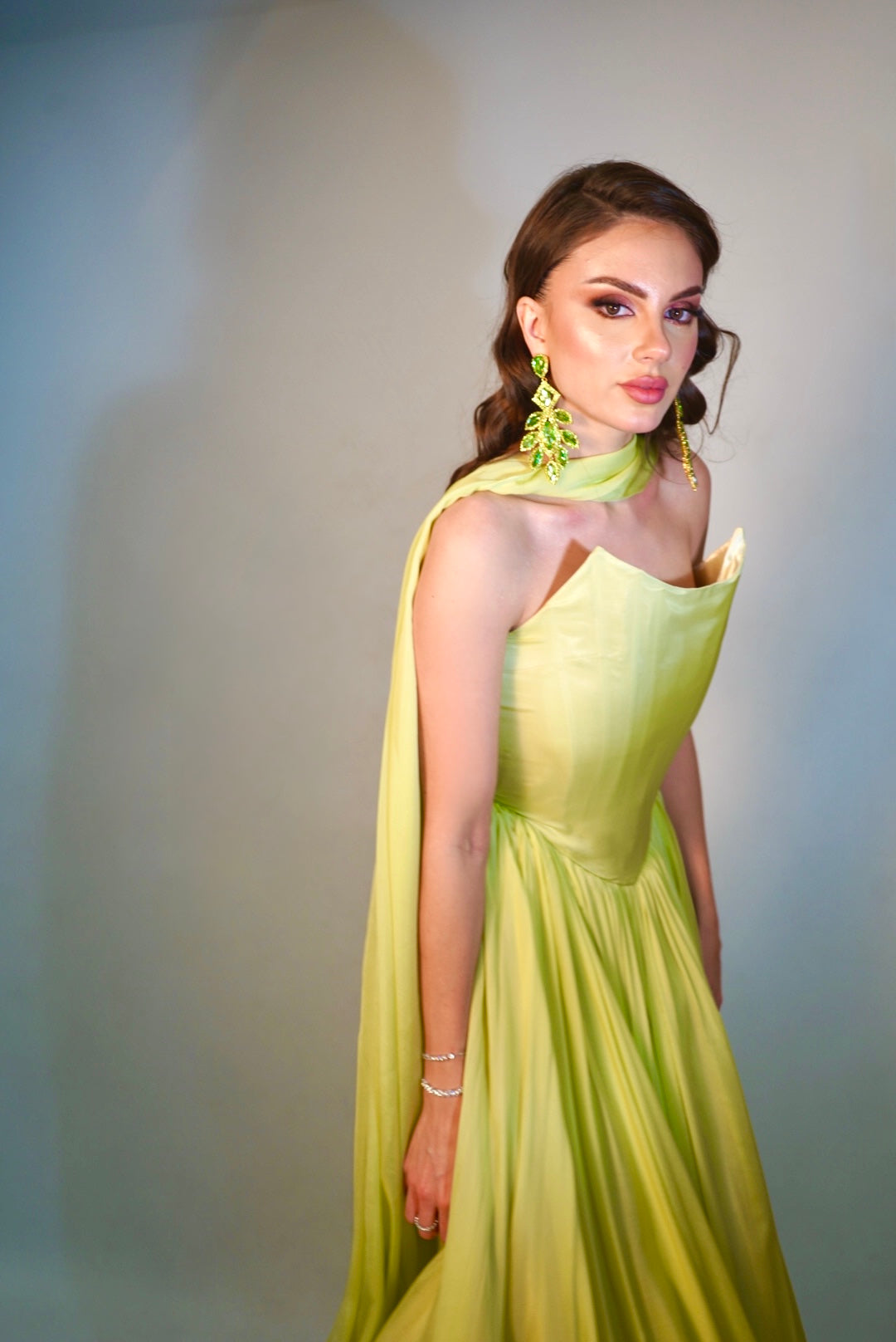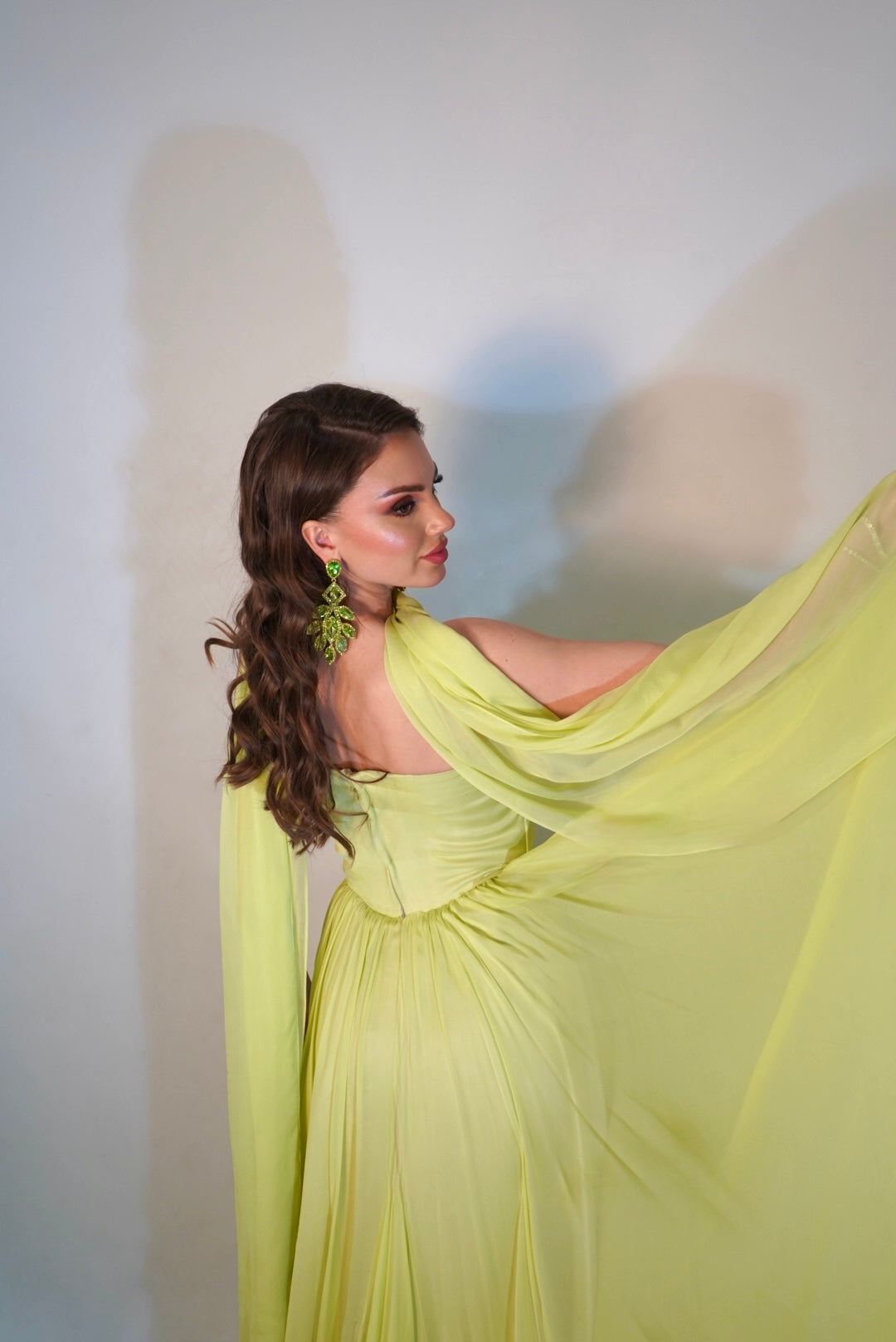 A flowing green pure silk gown with a wonderful silk veil to match.