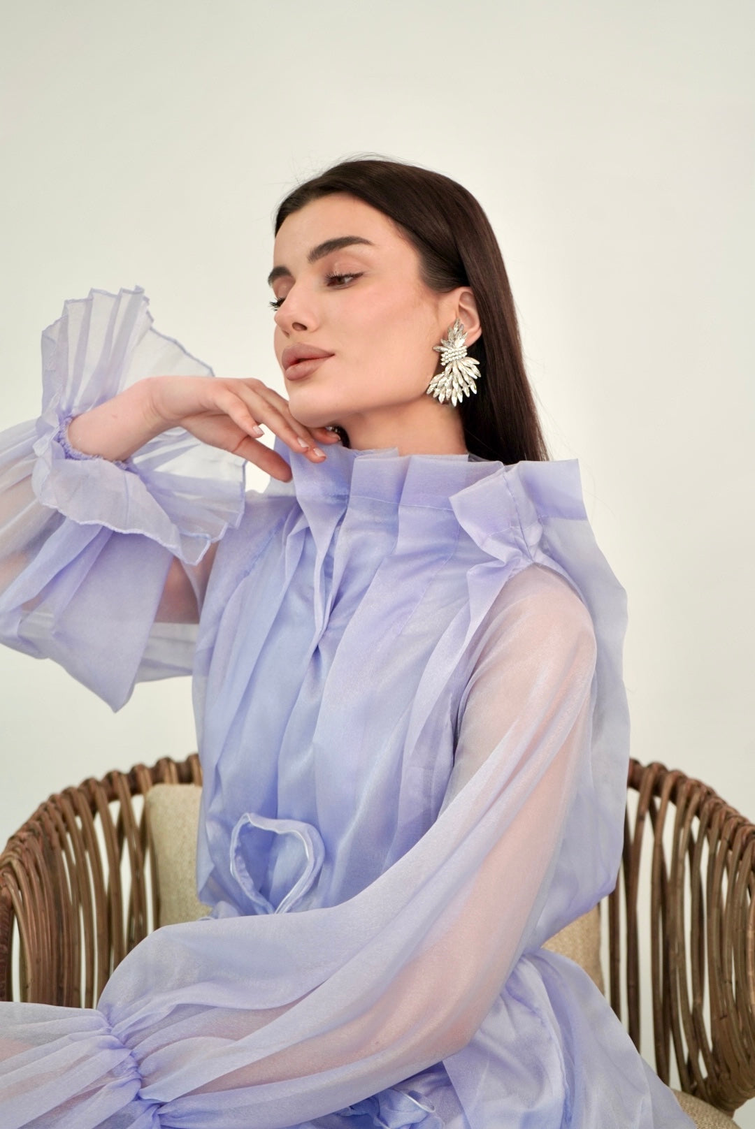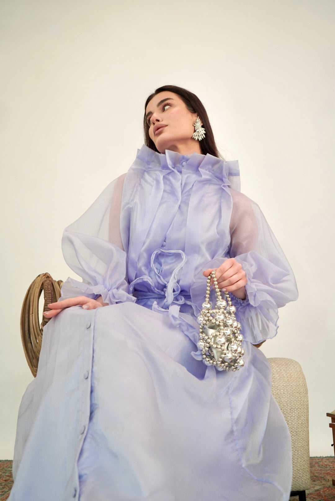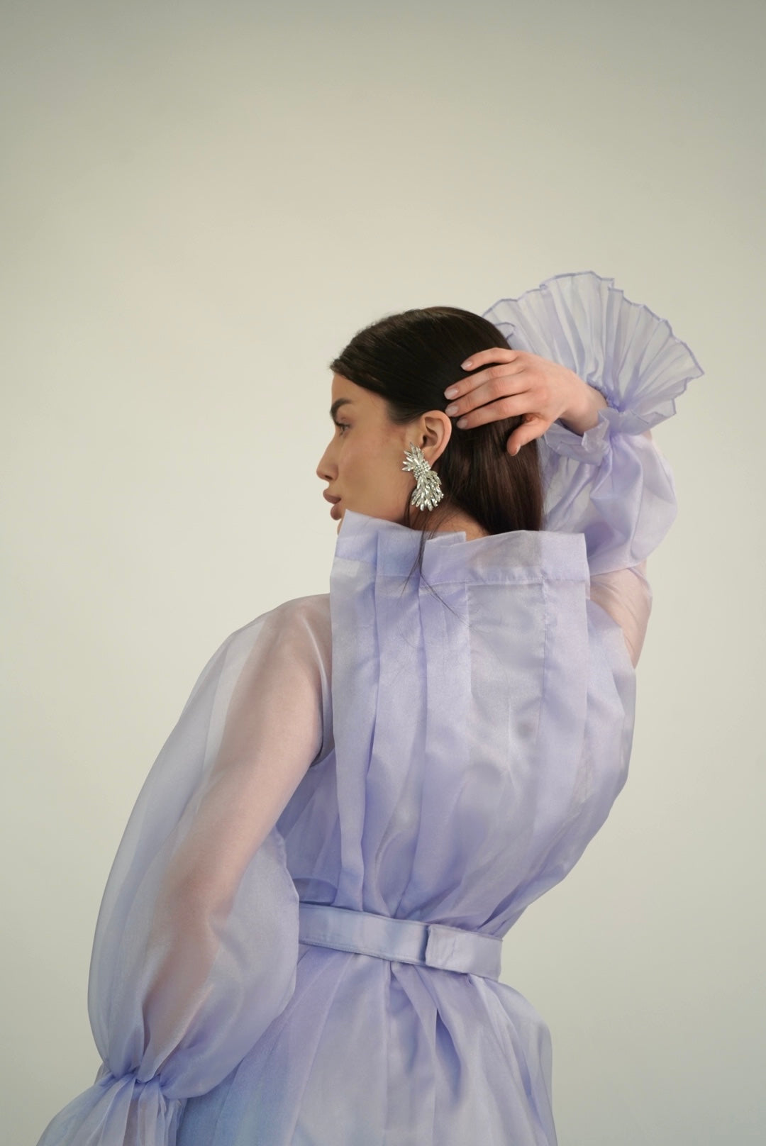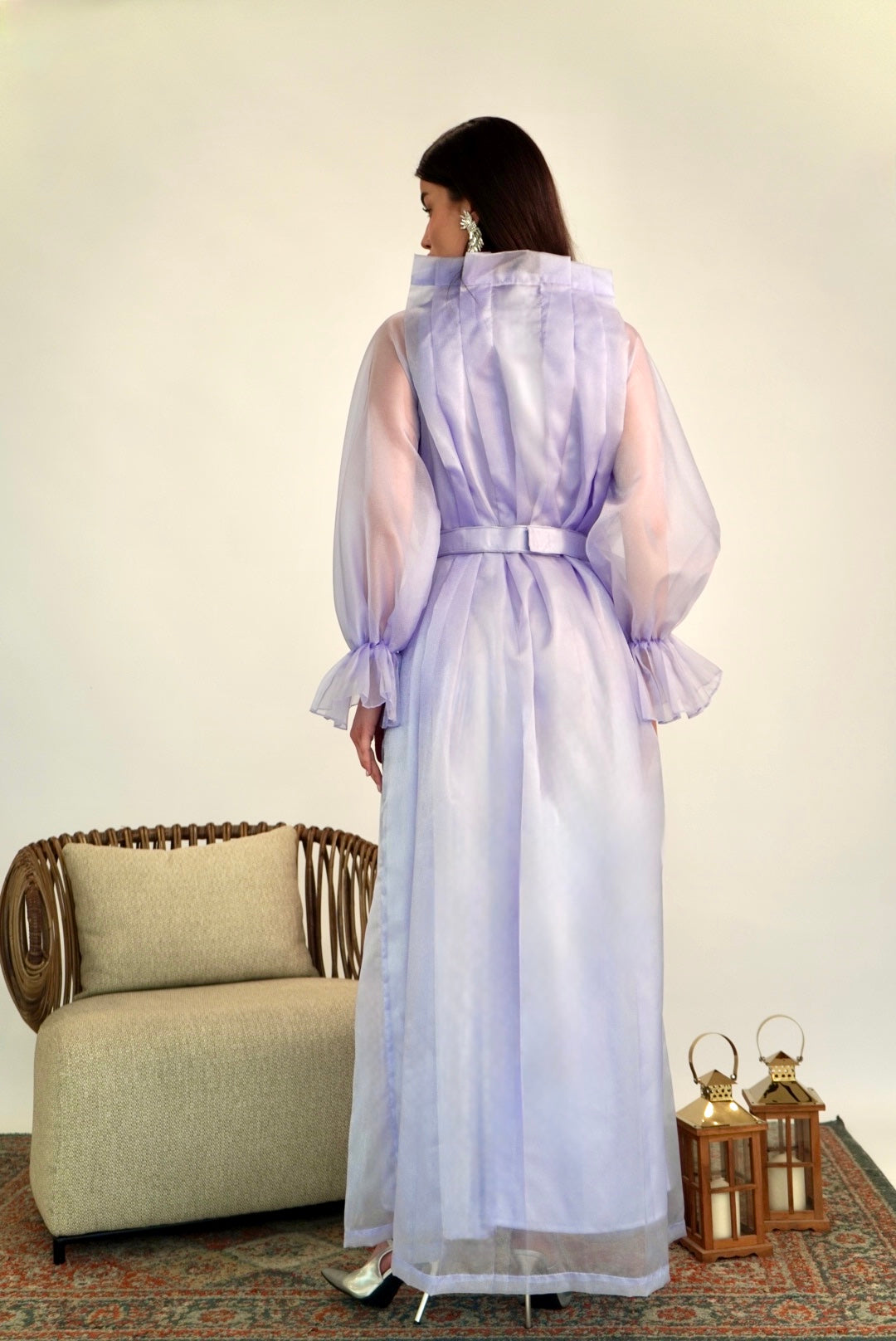 Lavender organza abaya with pleated cuffs and a soft belt—calm grace for the opening night.