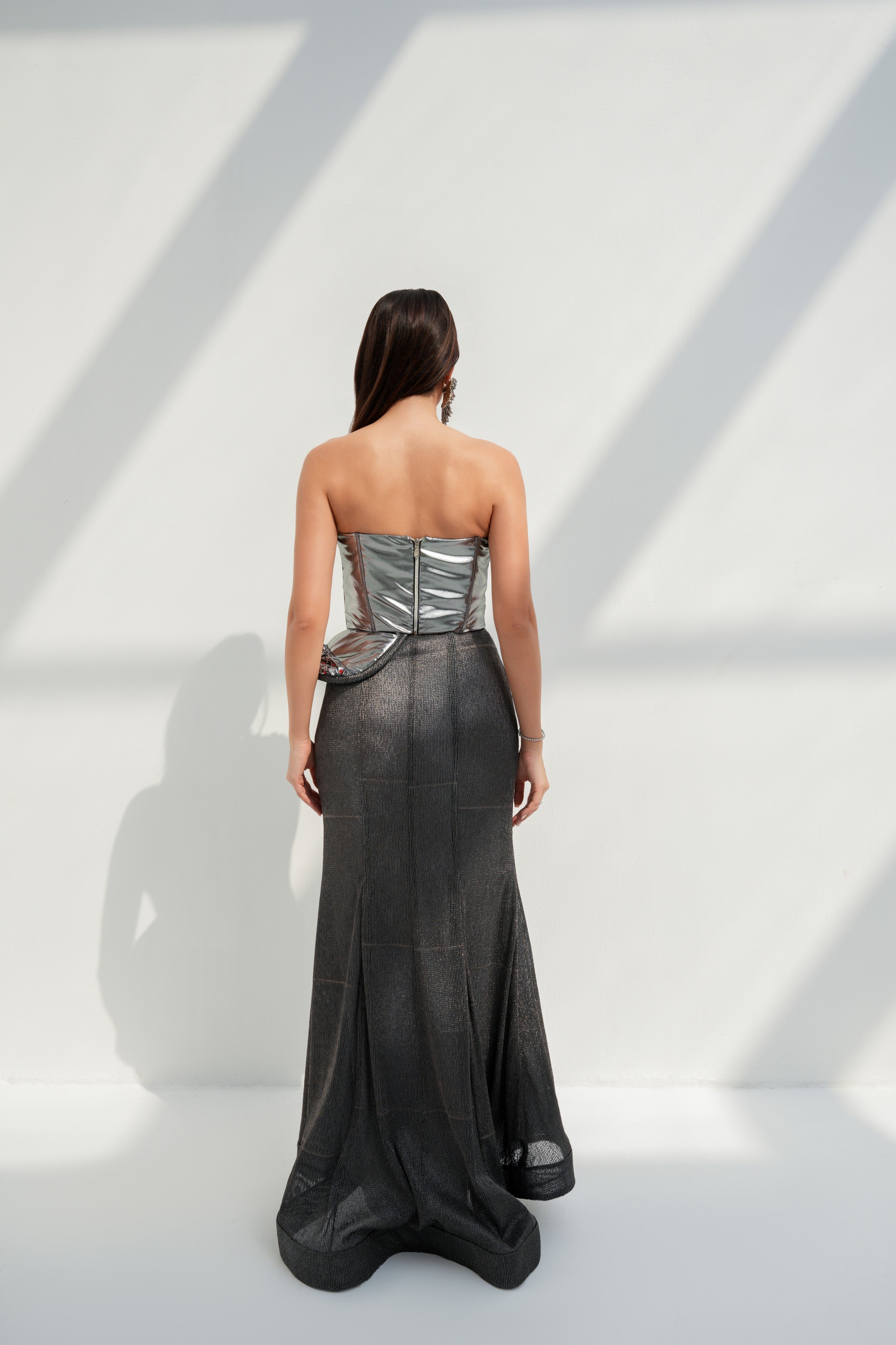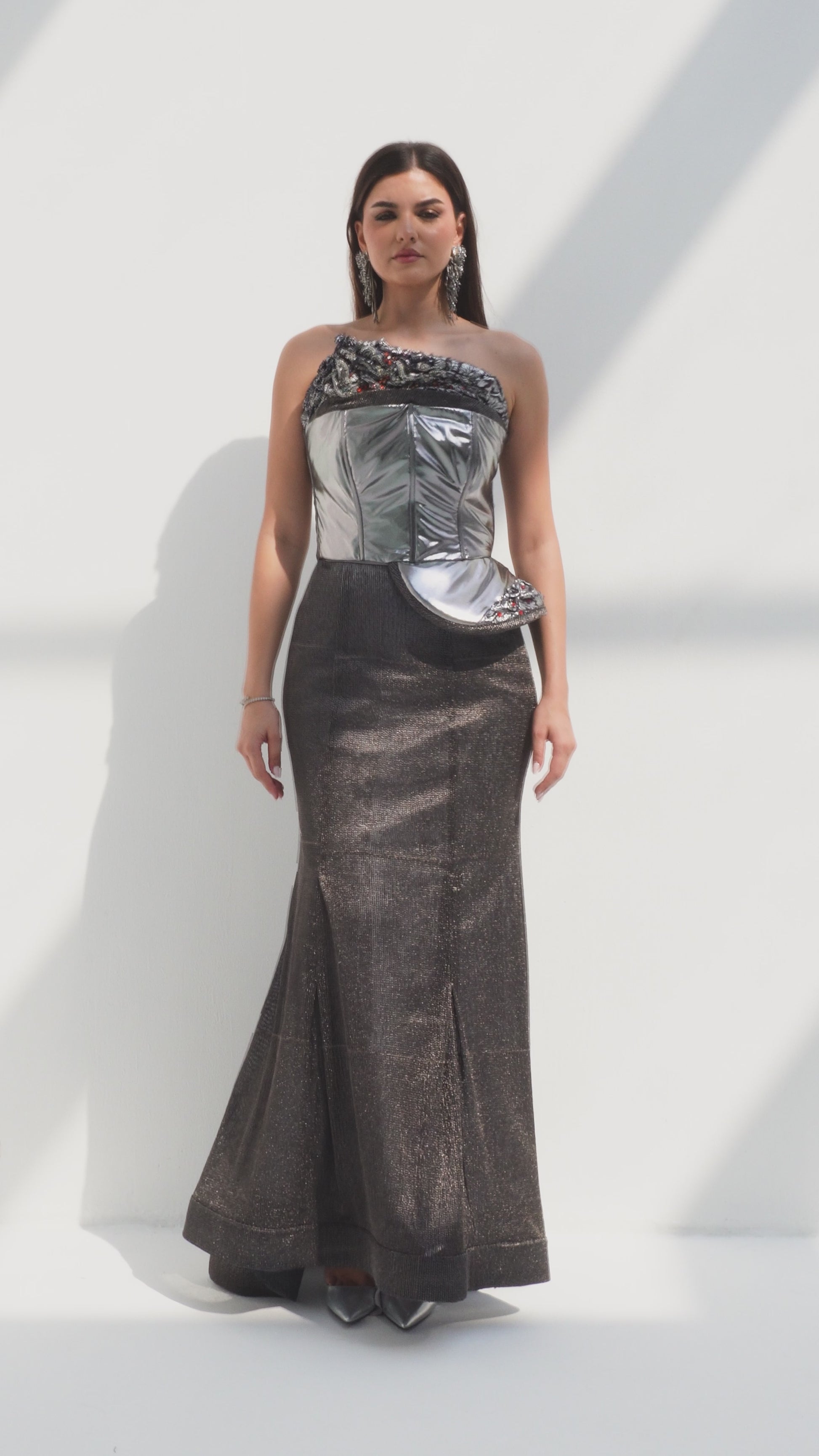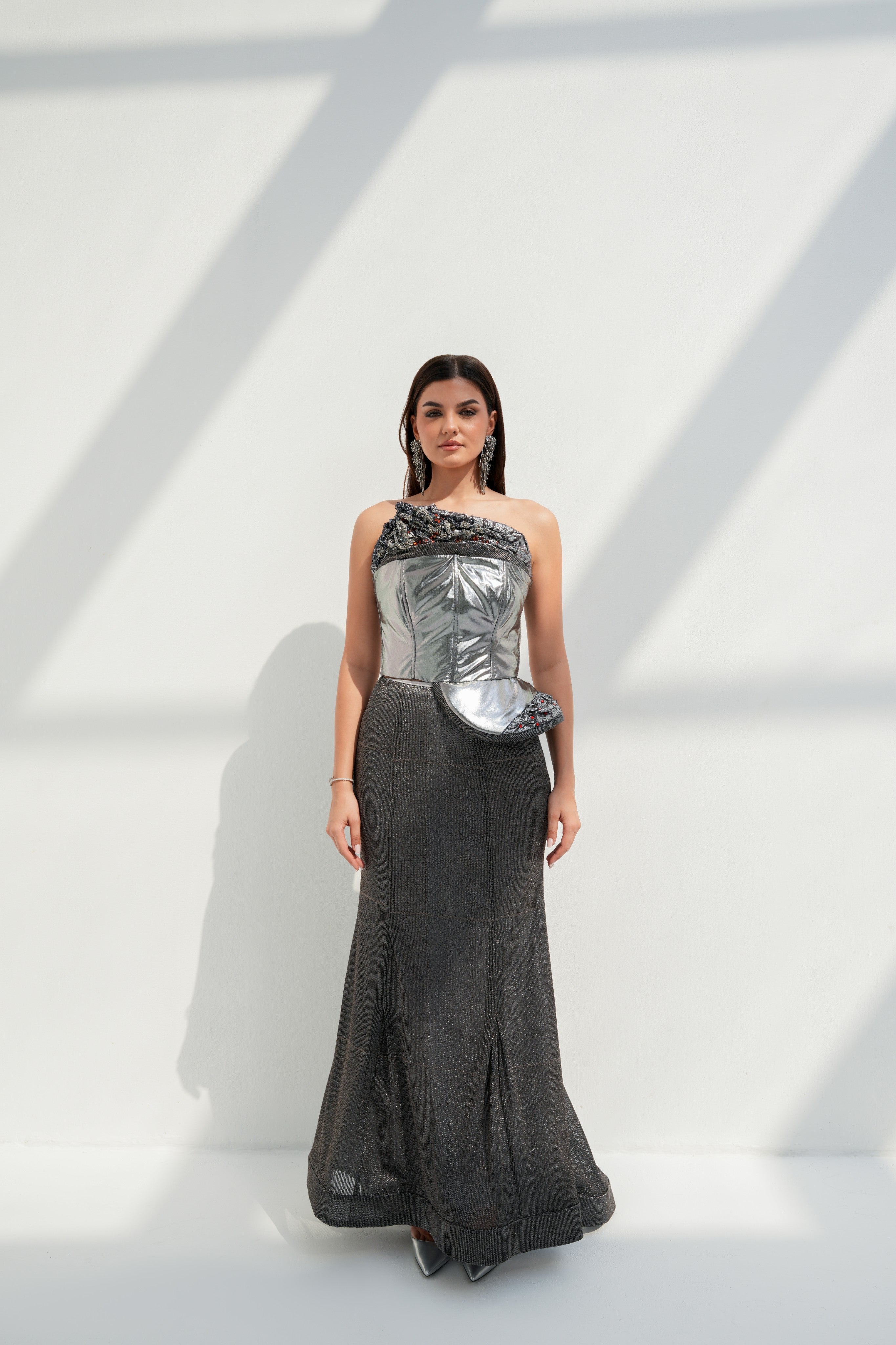 A cool, liquid-gloss black satin column drifts through inky light, its fine silver filaments scattering soft starlight with every step. Just the hush and shimmer of a Moonlit Promise kept.