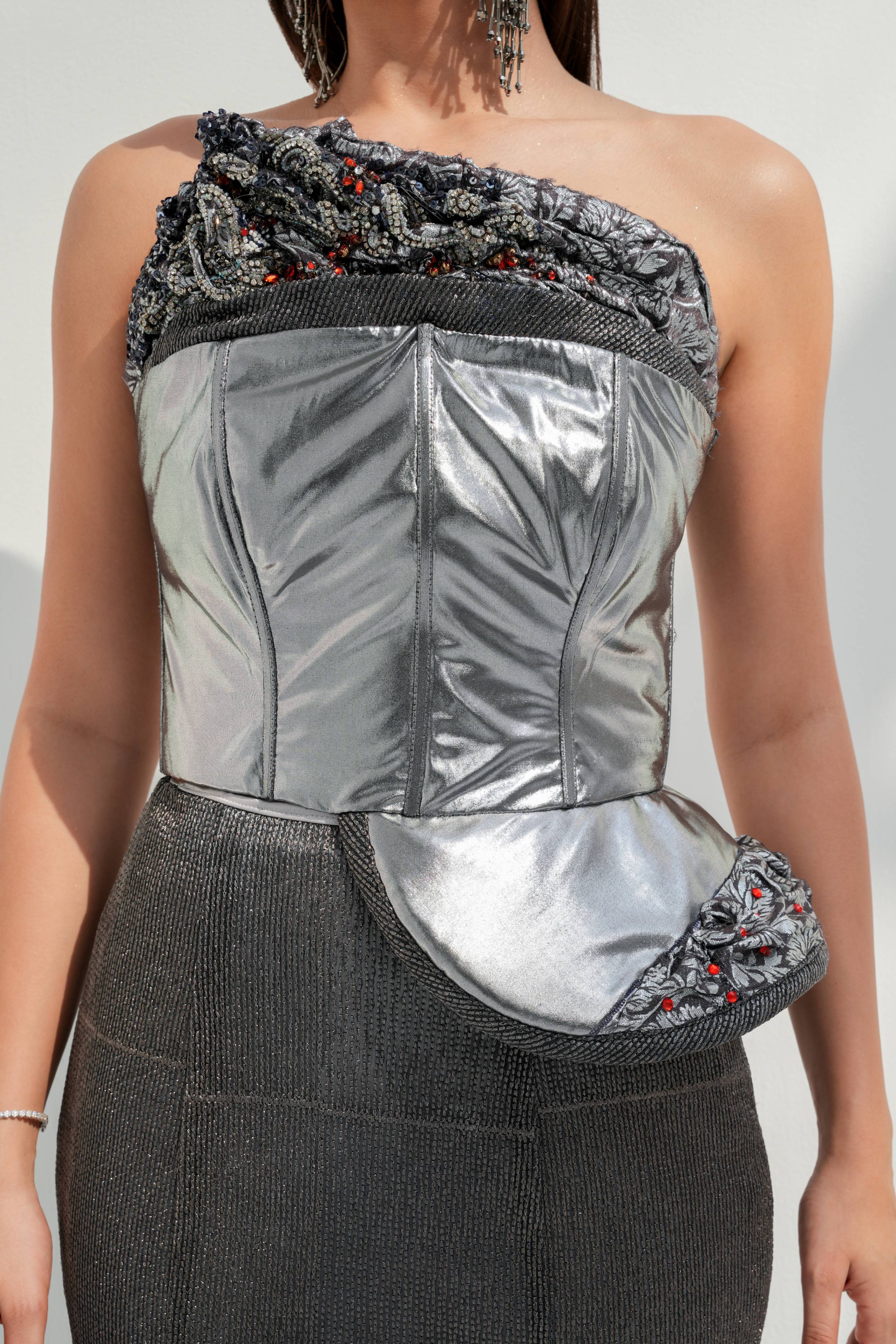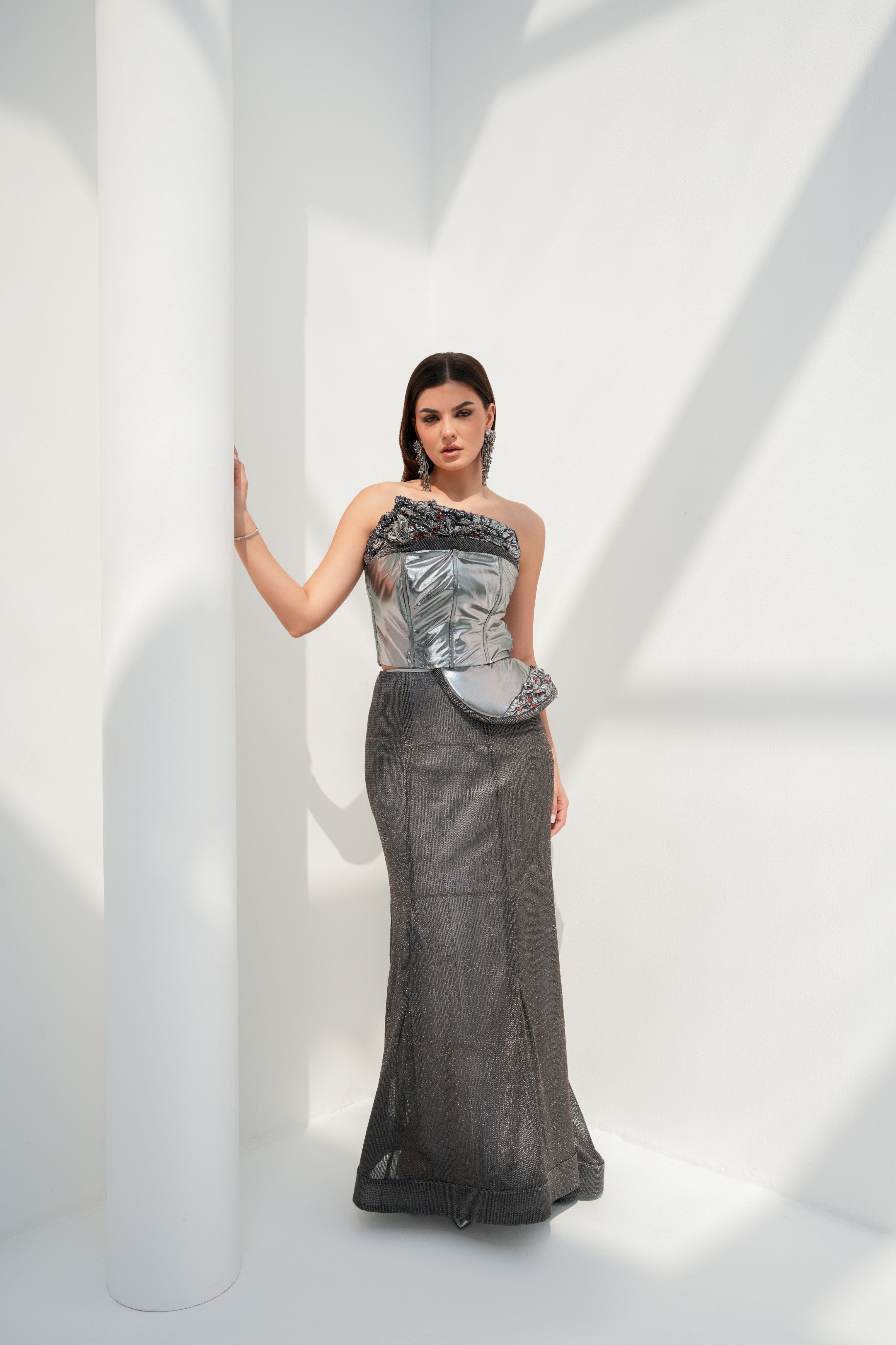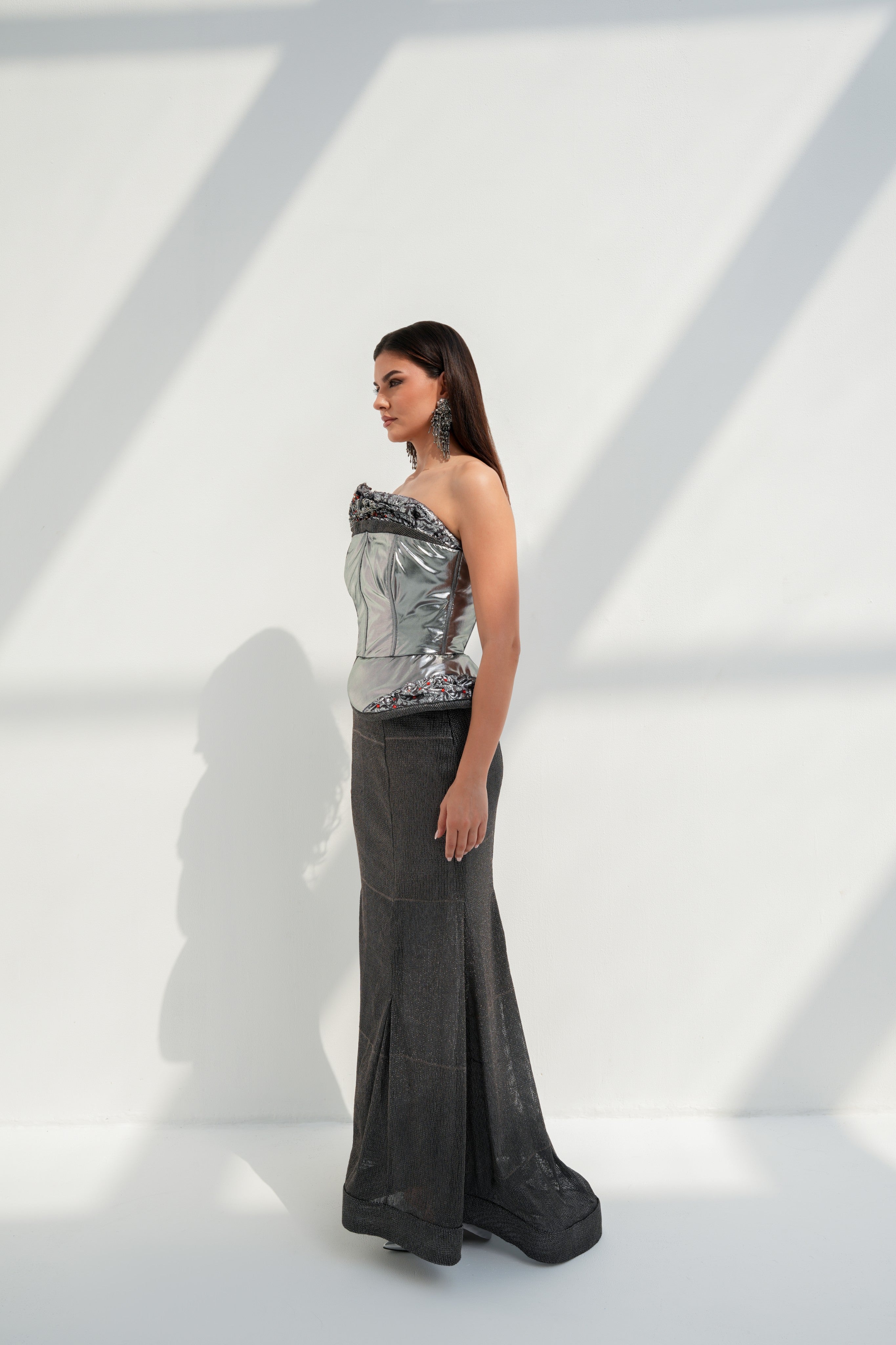 A cool, liquid-gloss black satin column drifts through inky light, its fine silver filaments scattering soft starlight with every step. Just the hush and shimmer of a Moonlit Promise kept.