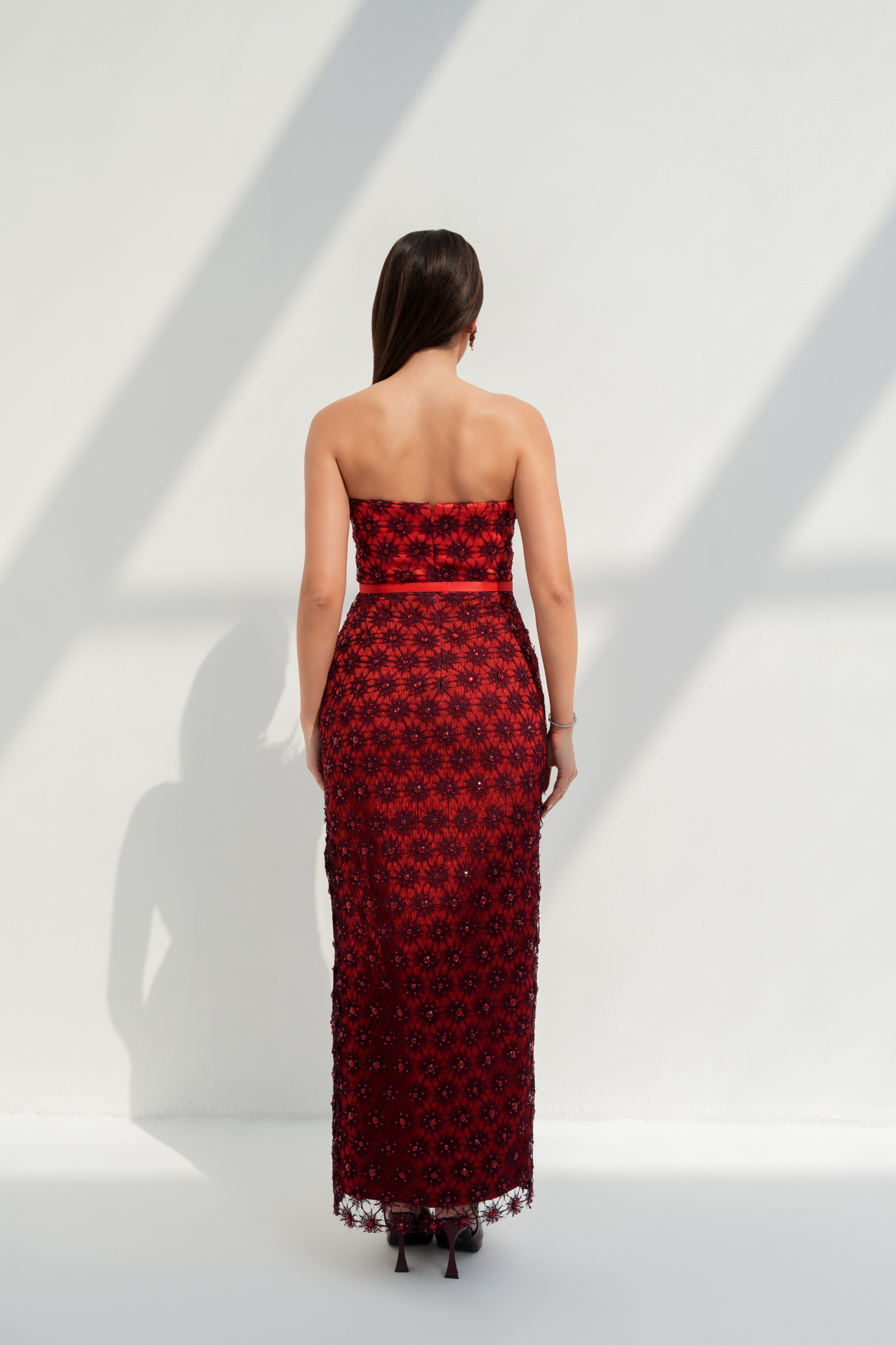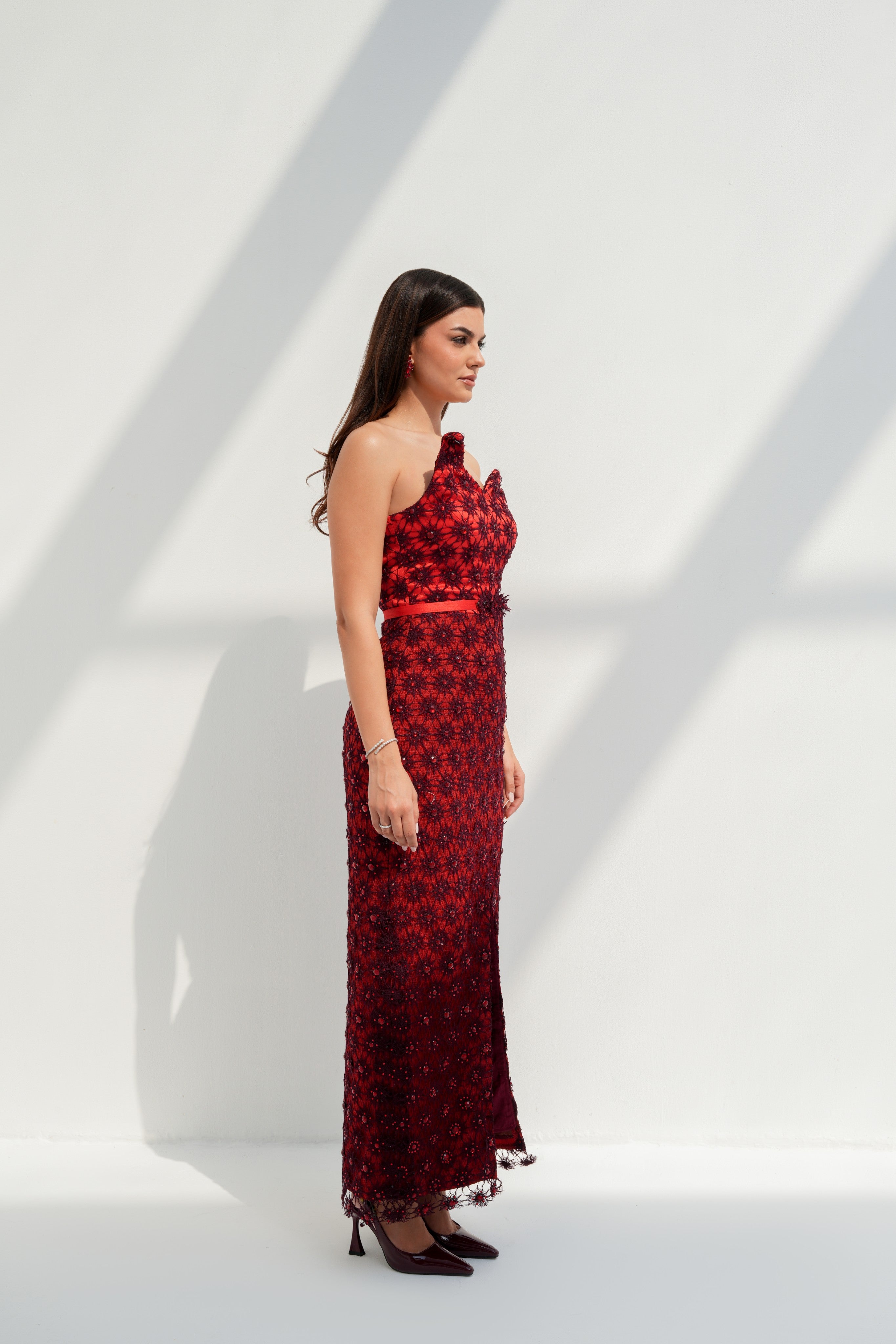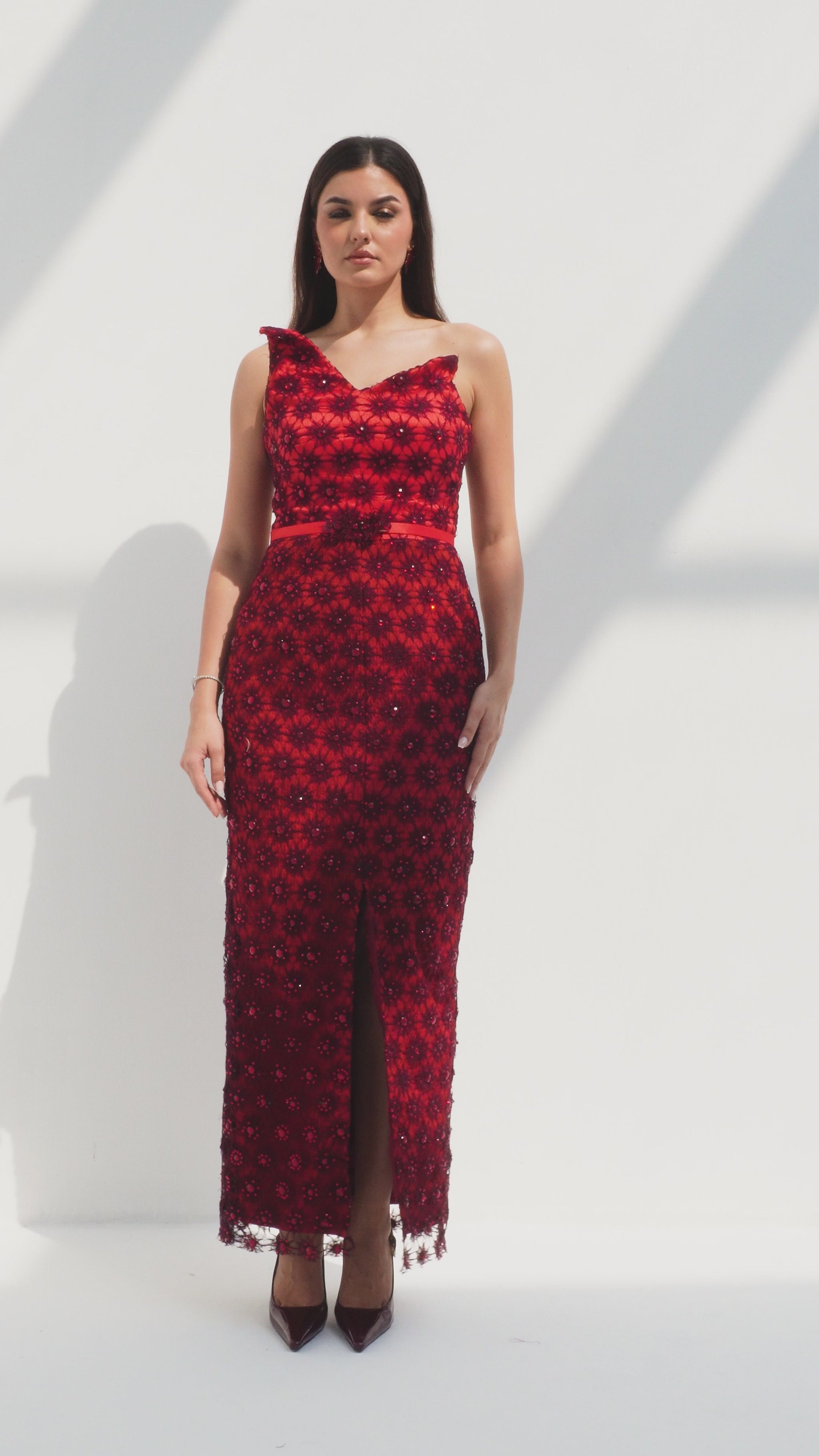 Crimson daisy-lace column with a petal crest and slim belt; tiny sparks gather into courage.