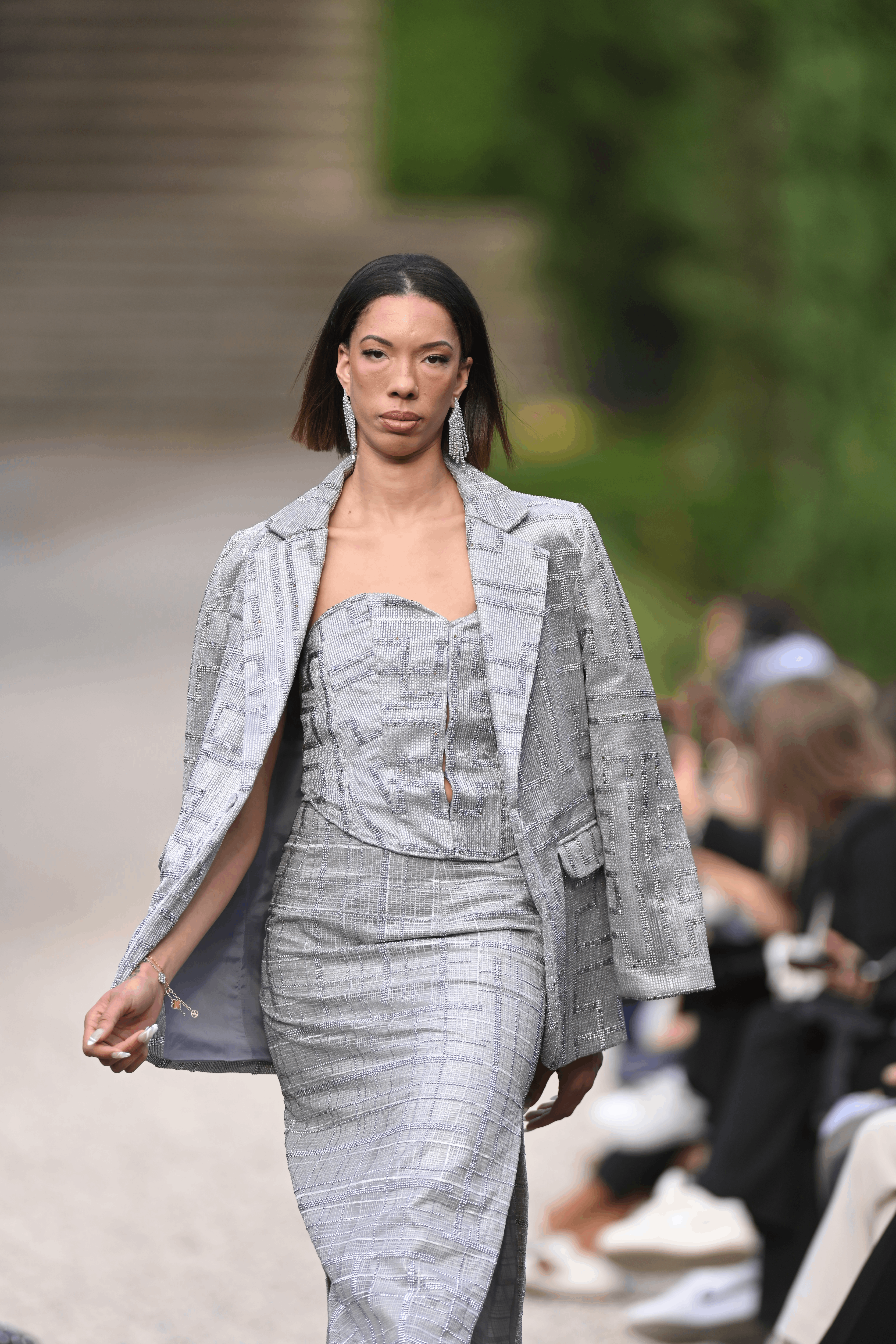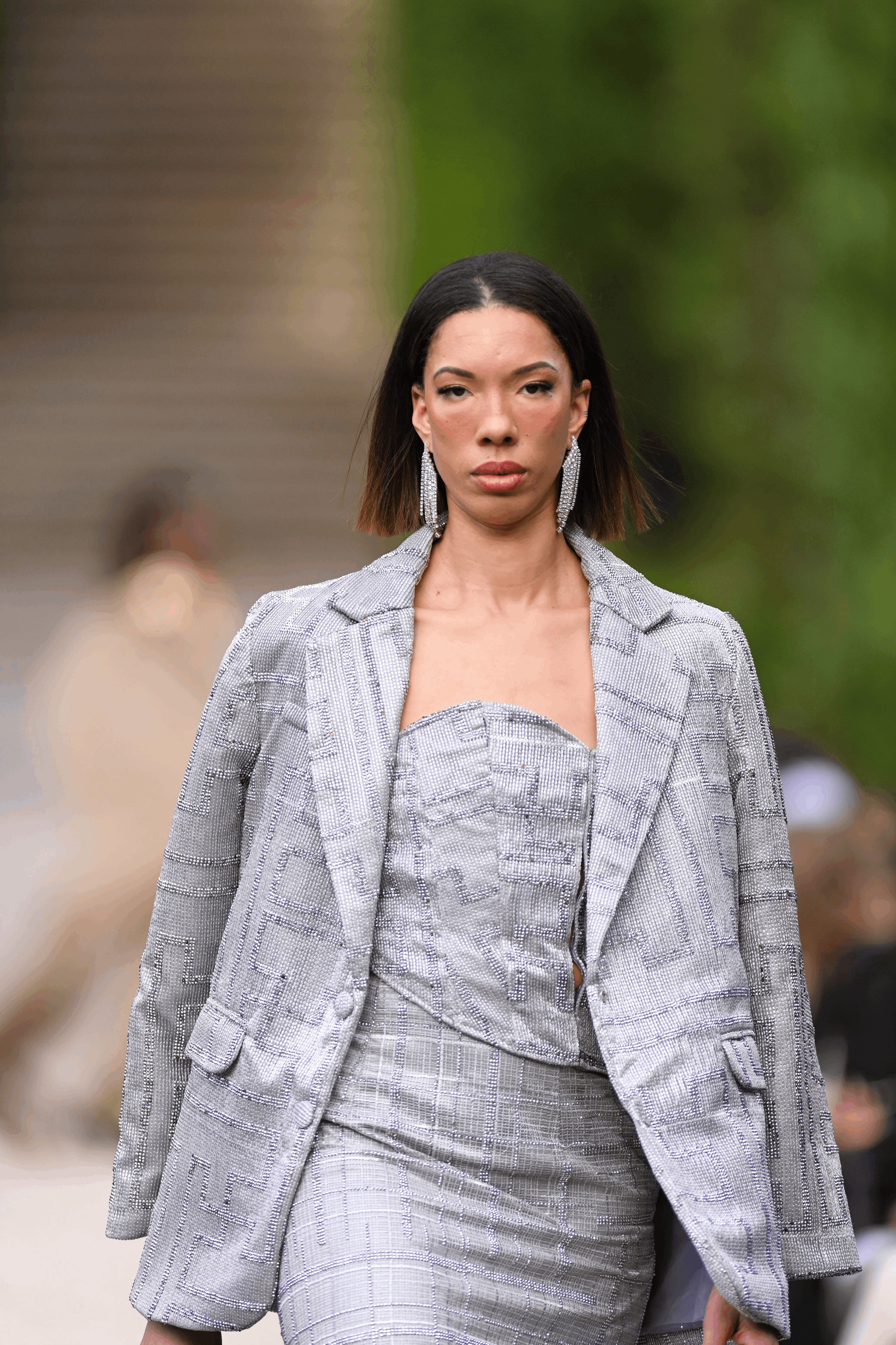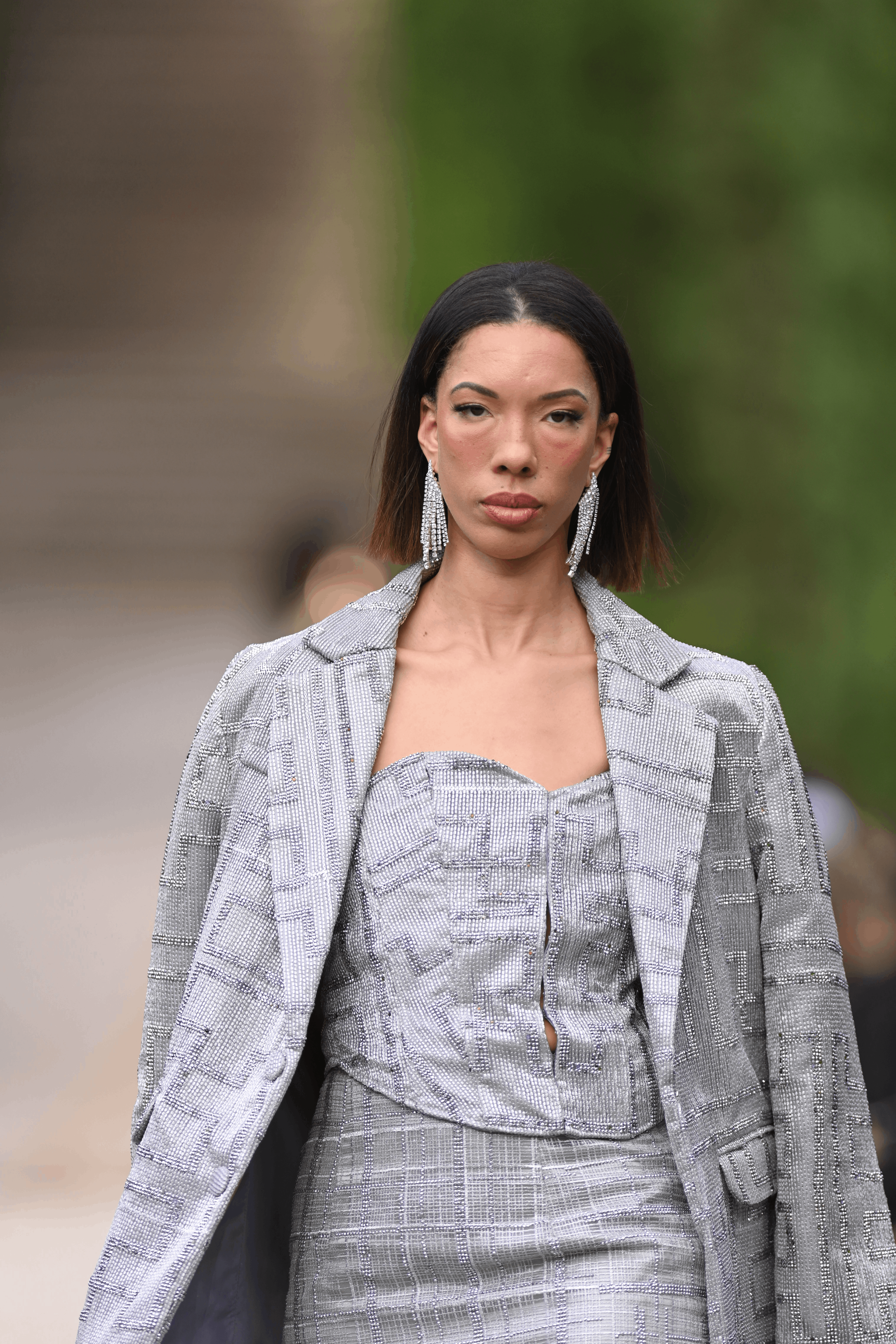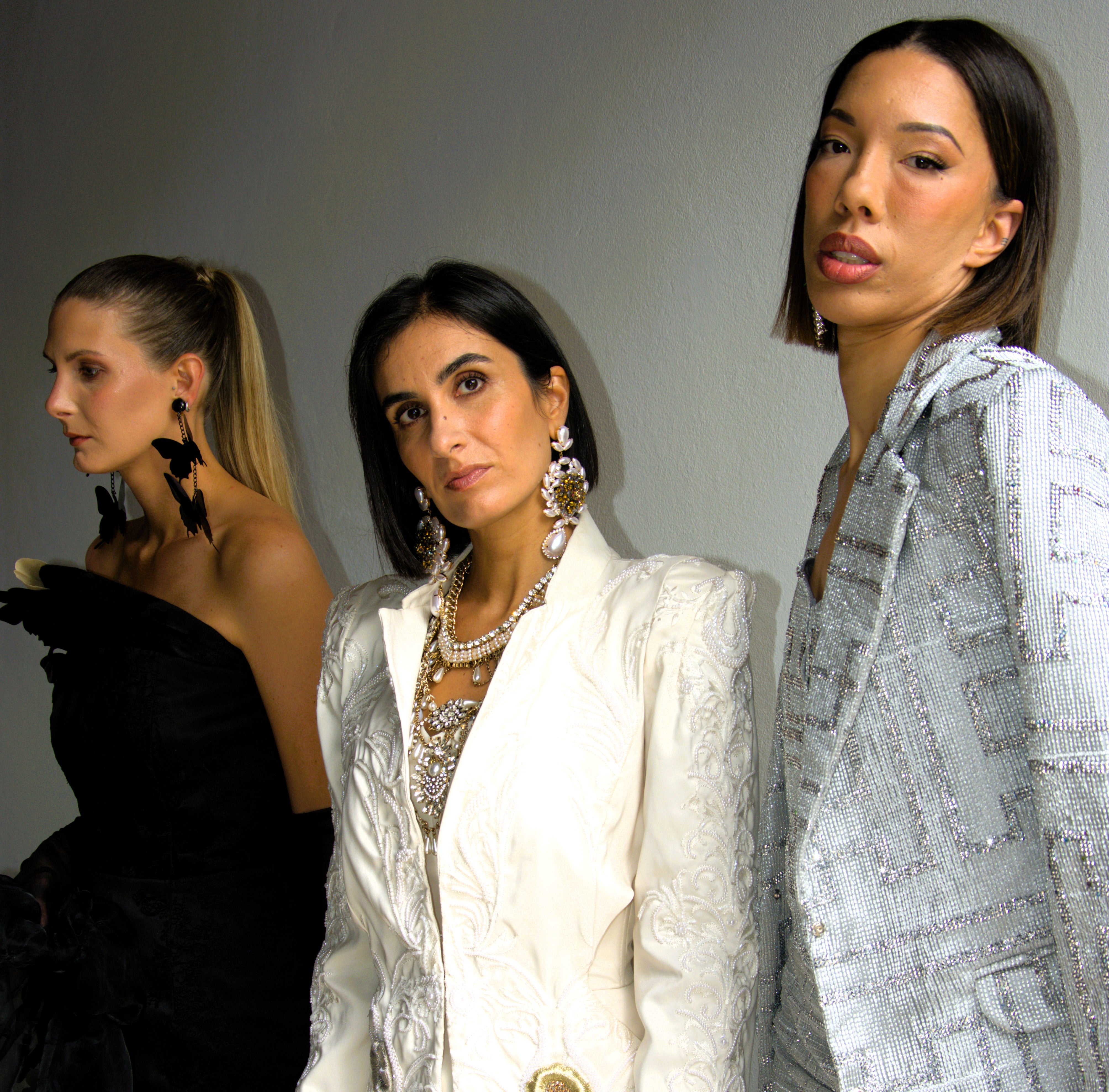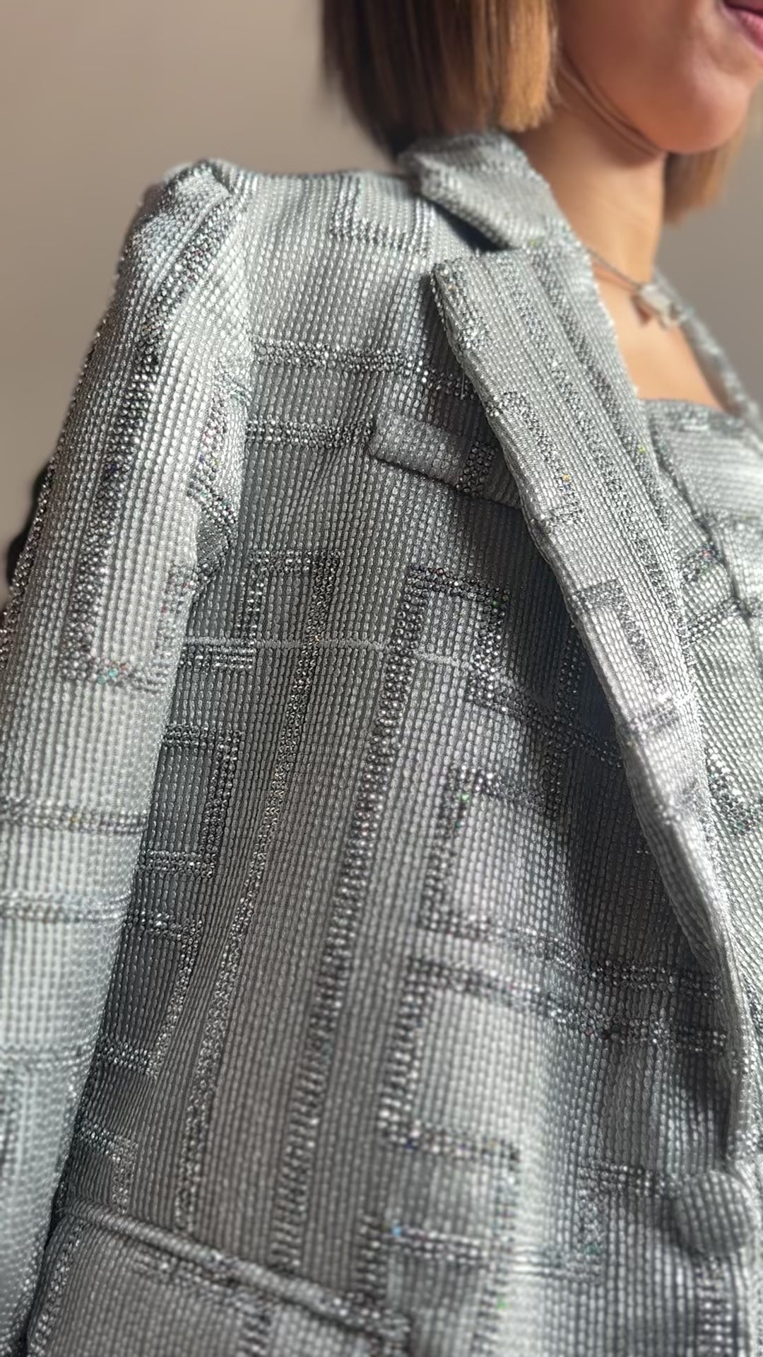 A crystalized three piece design that is fitted yet elegently draped with a structed jacket.