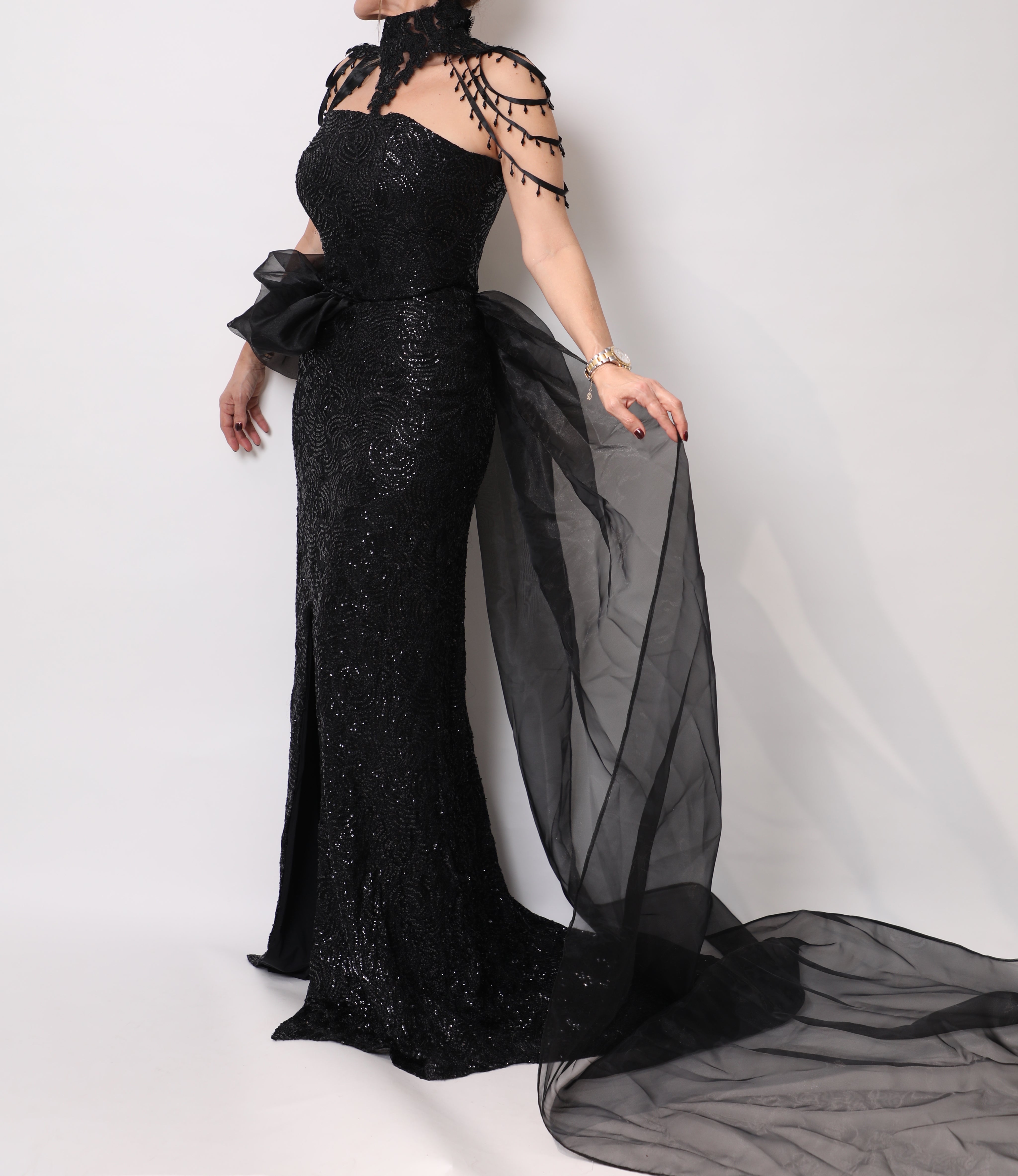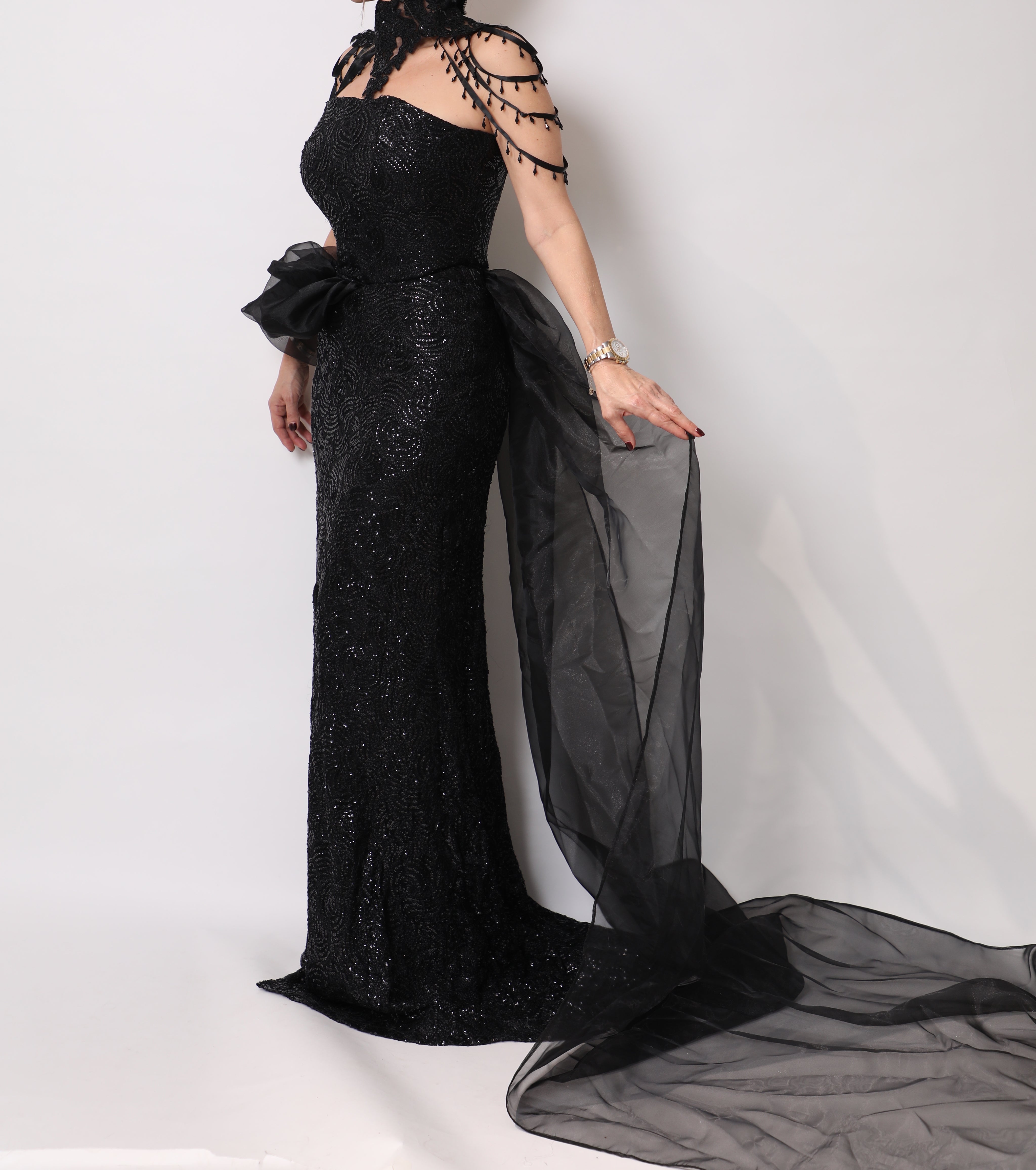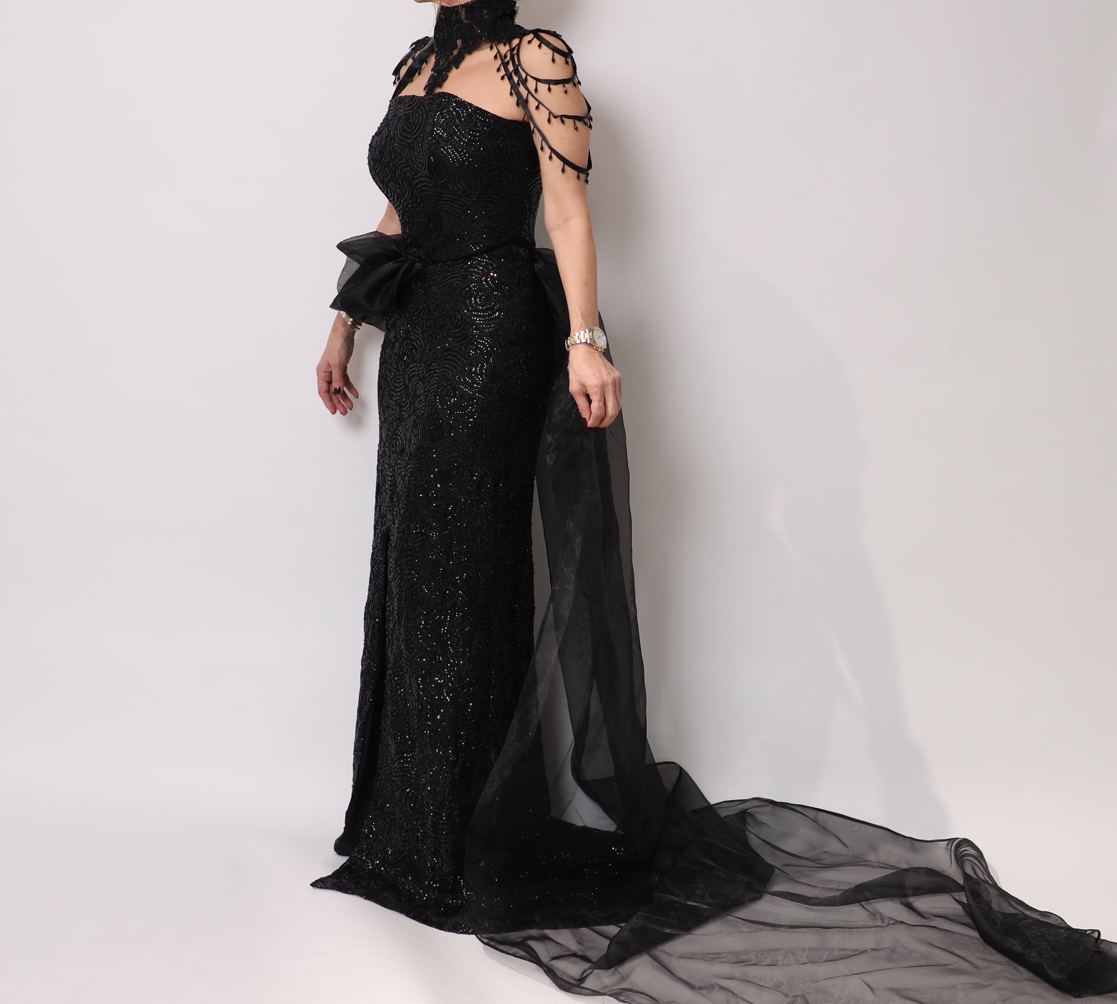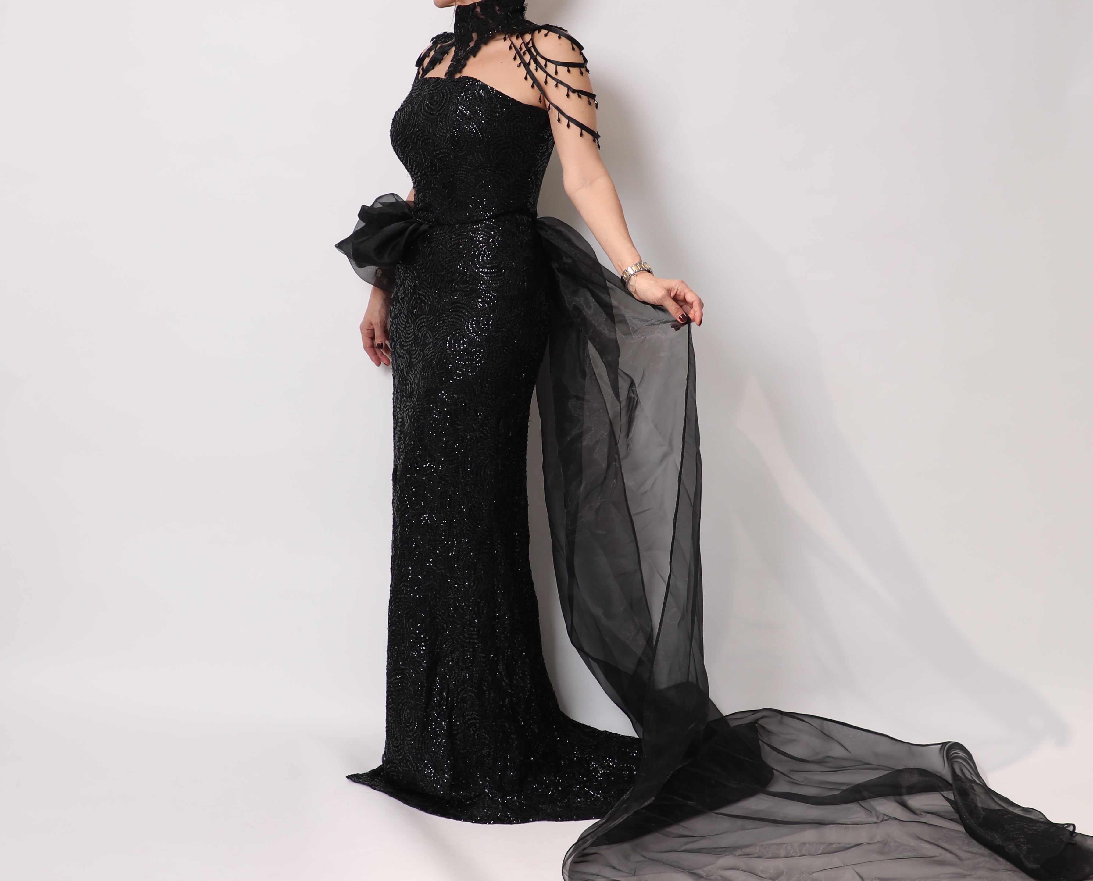 A dramatic Black dress with an atatchment for the shoulder and an extra drapped efect.