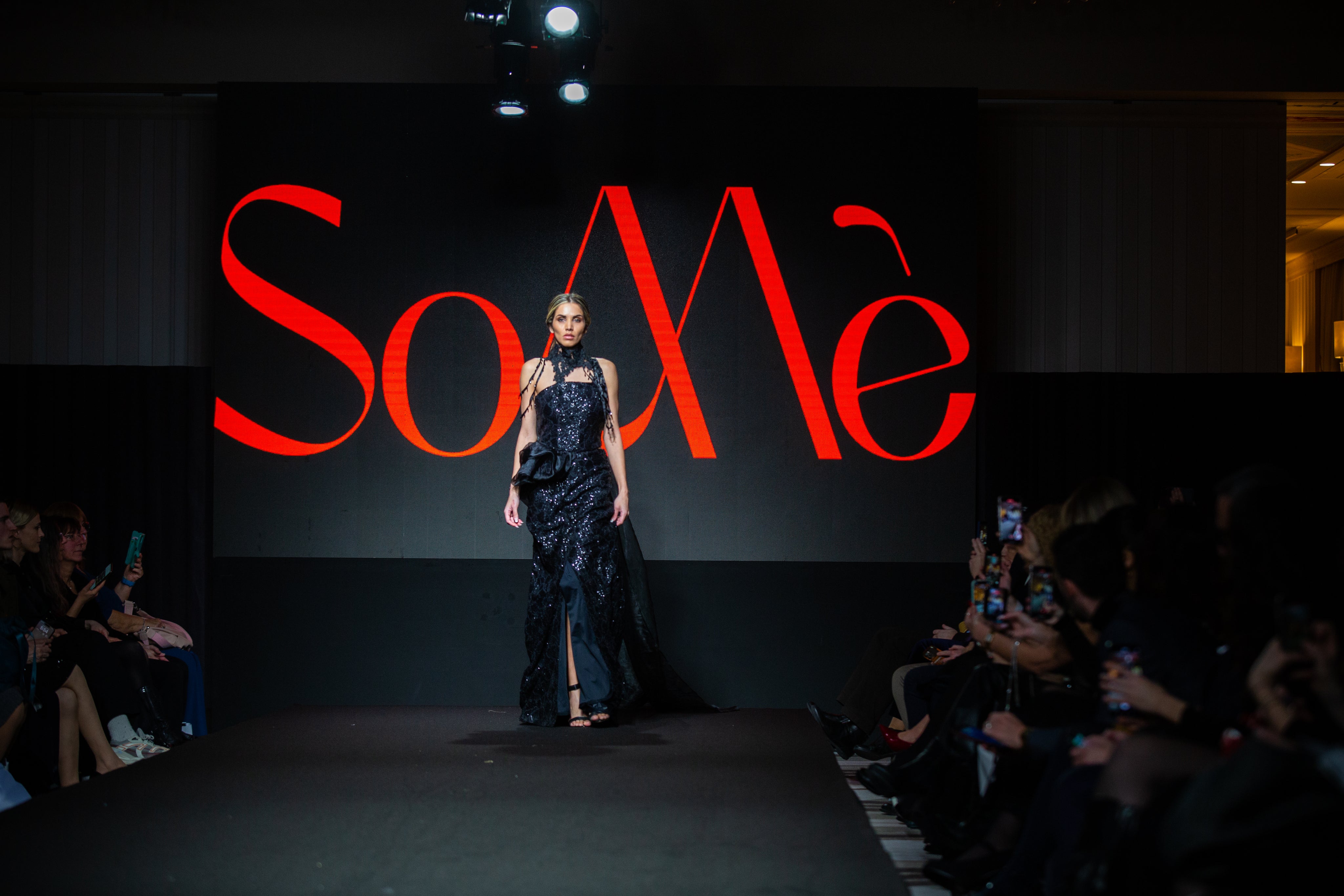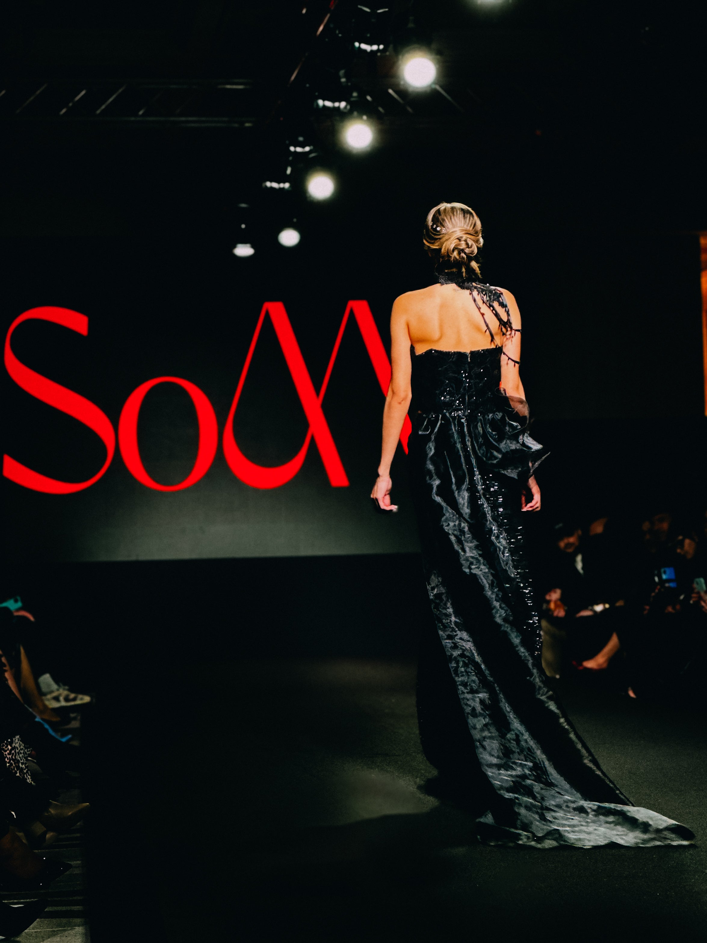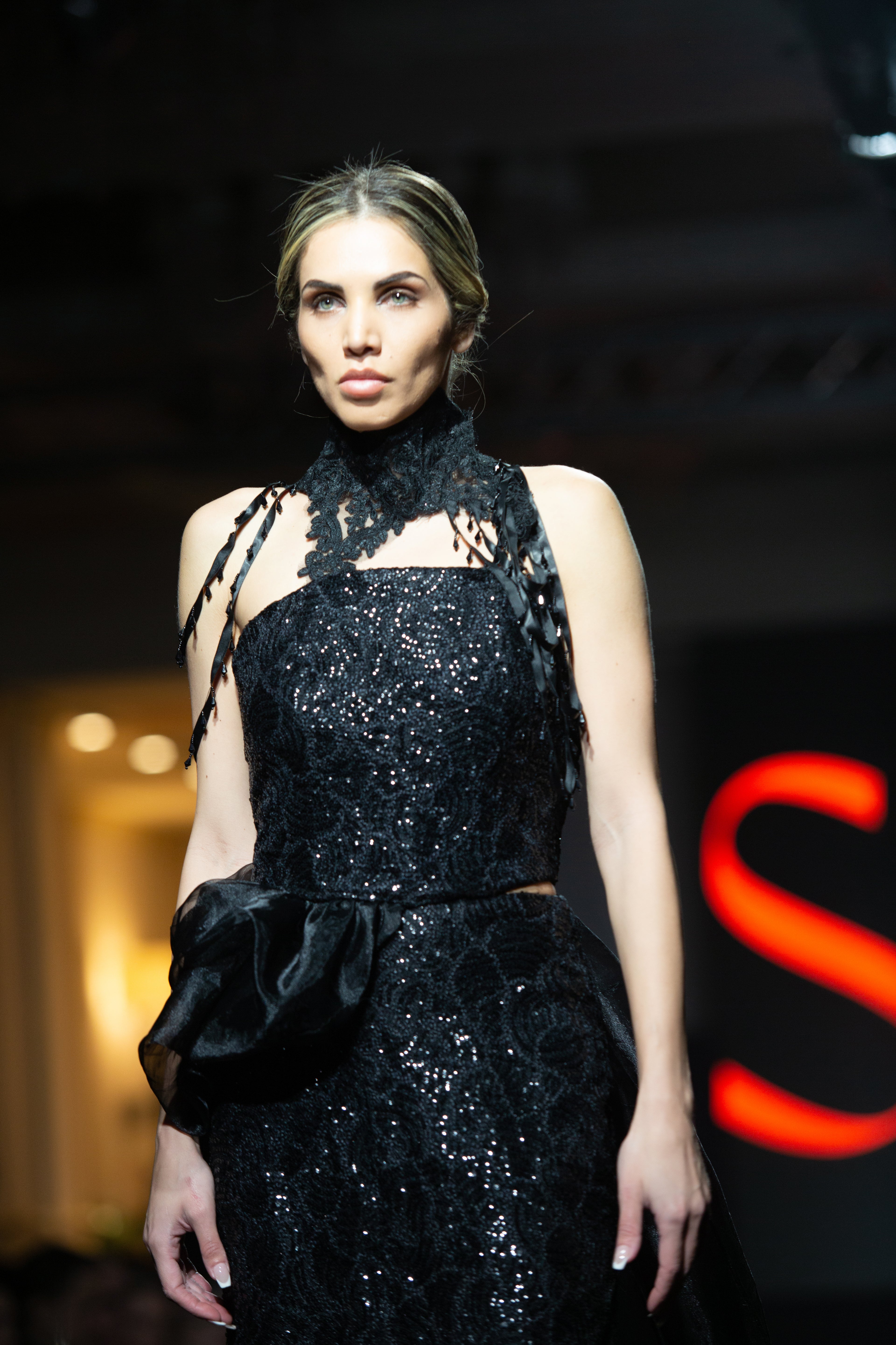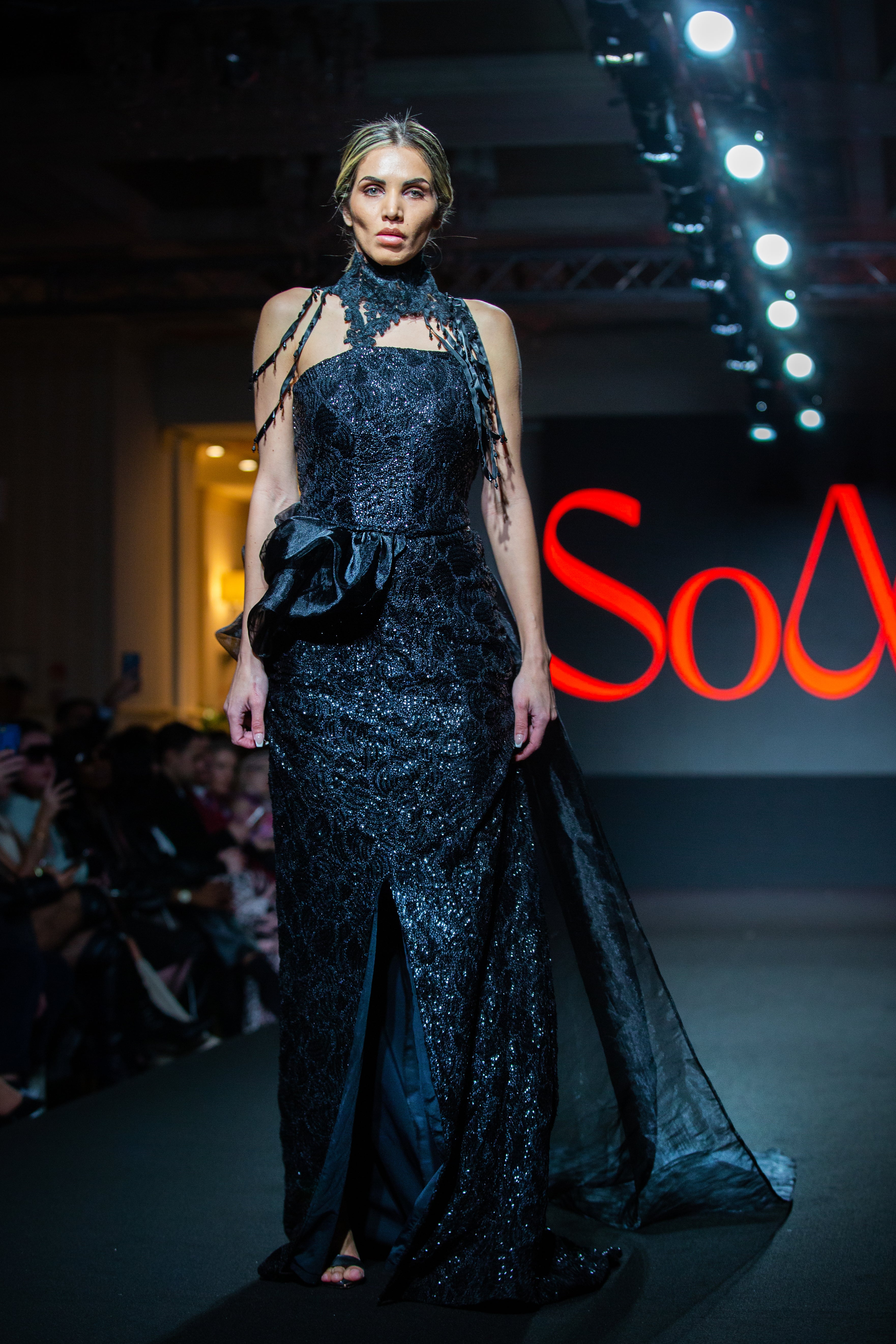 A dramatic Black dress with an atatchment for the shoulder and an extra drapped efect.
