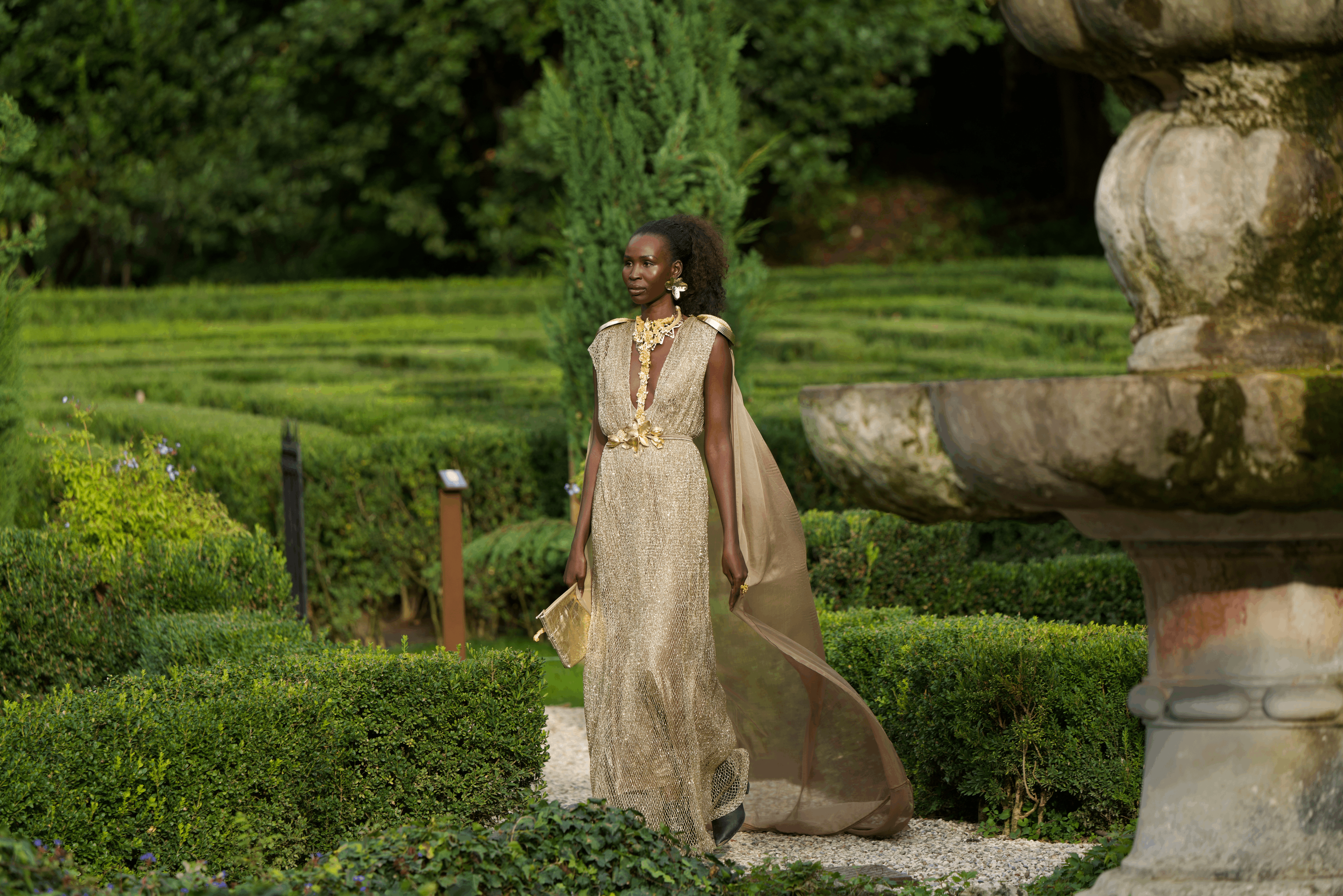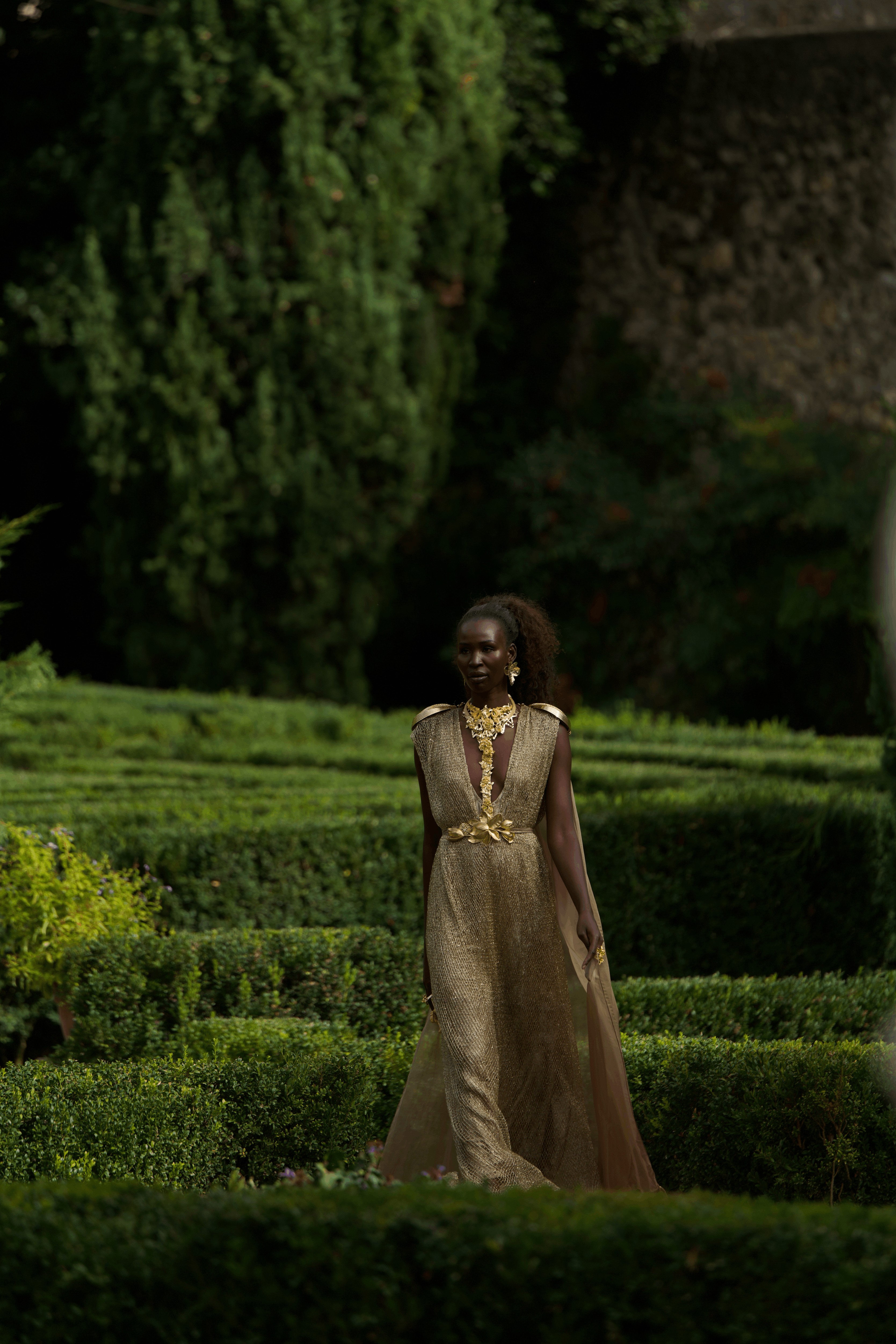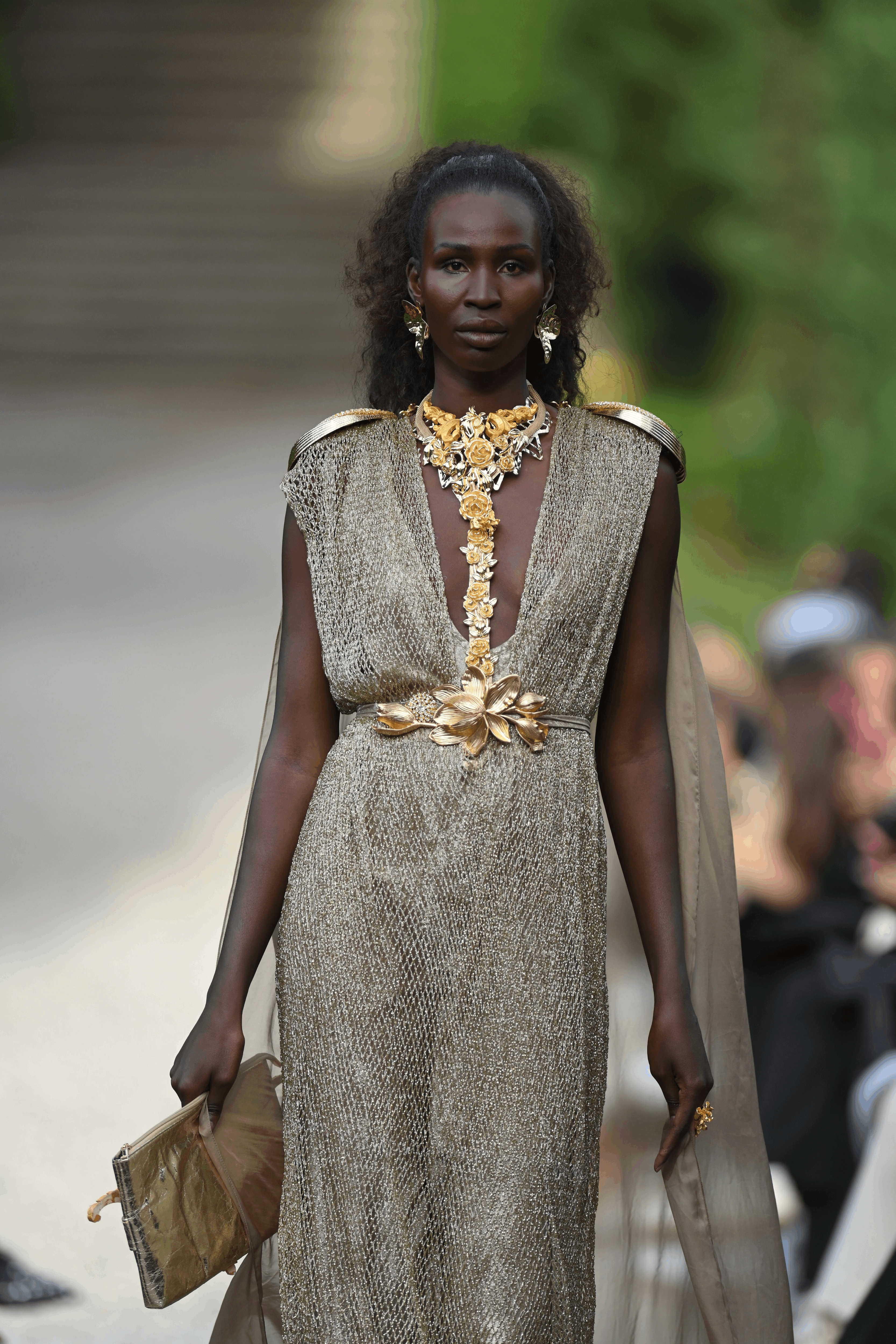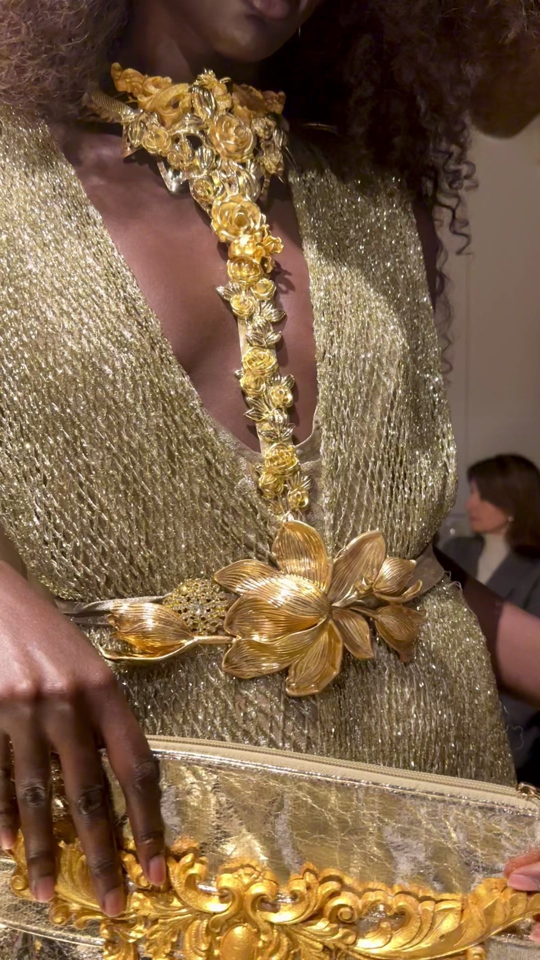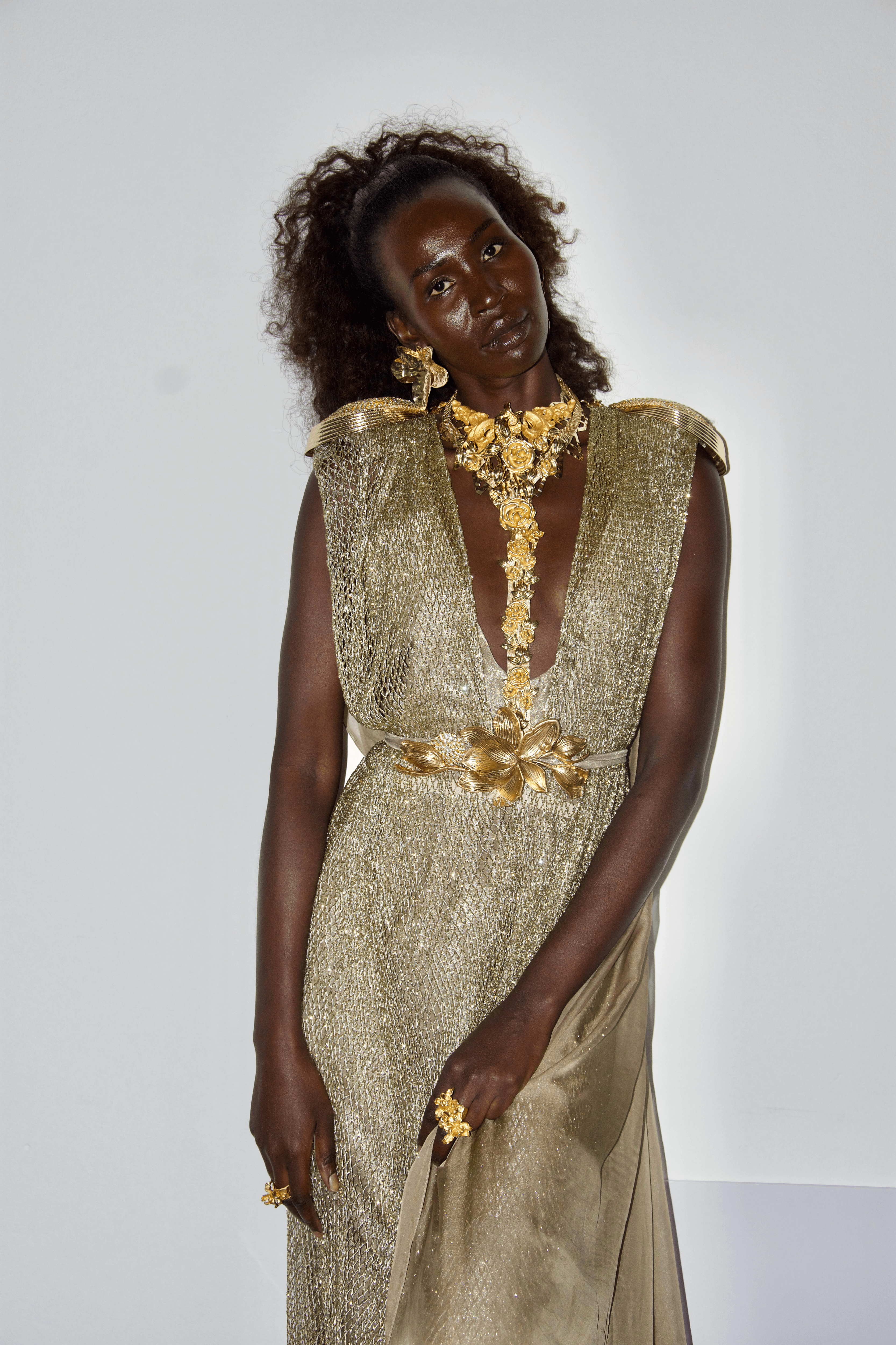 A unique piece of gold art that comes with an accessory to match and complete the metalic look.