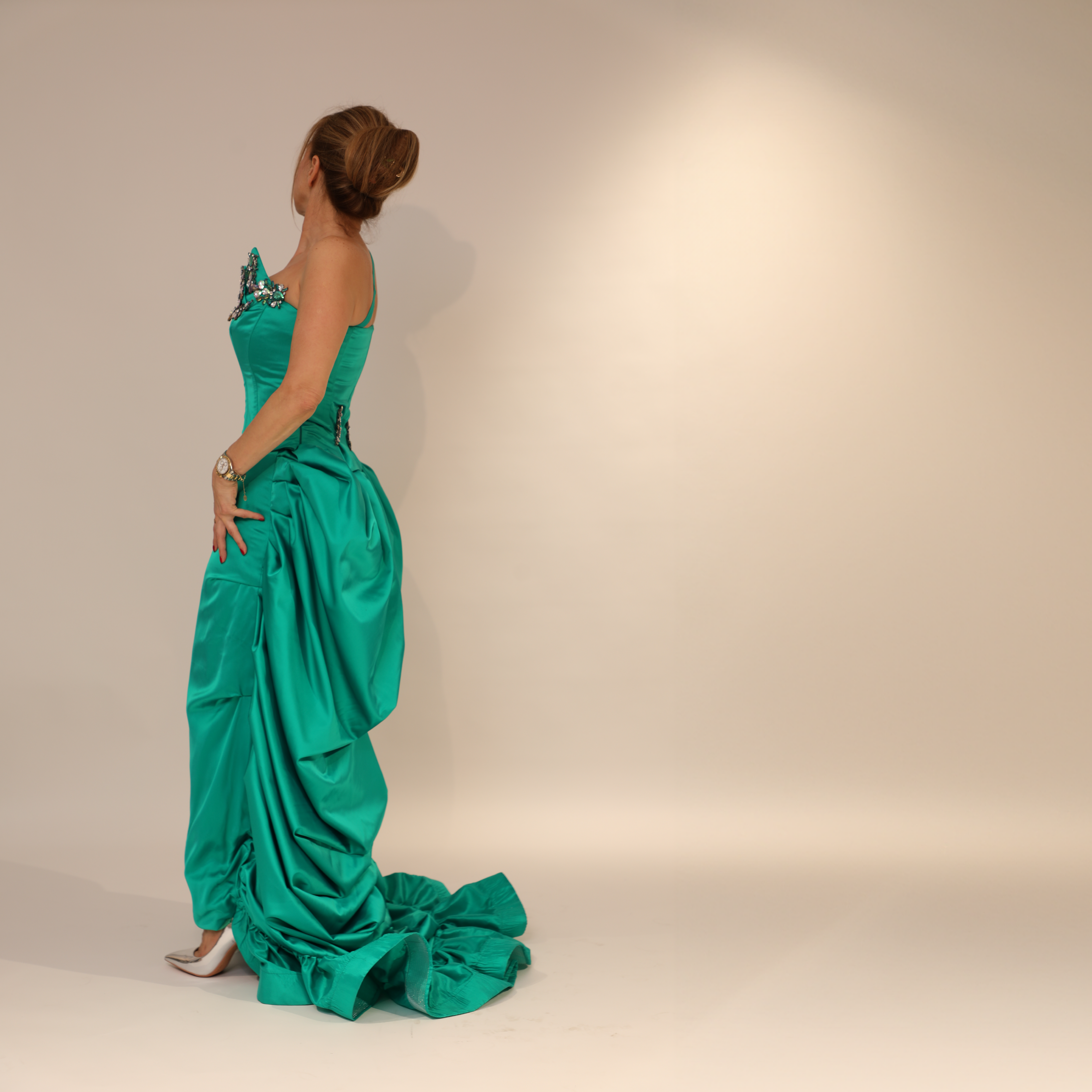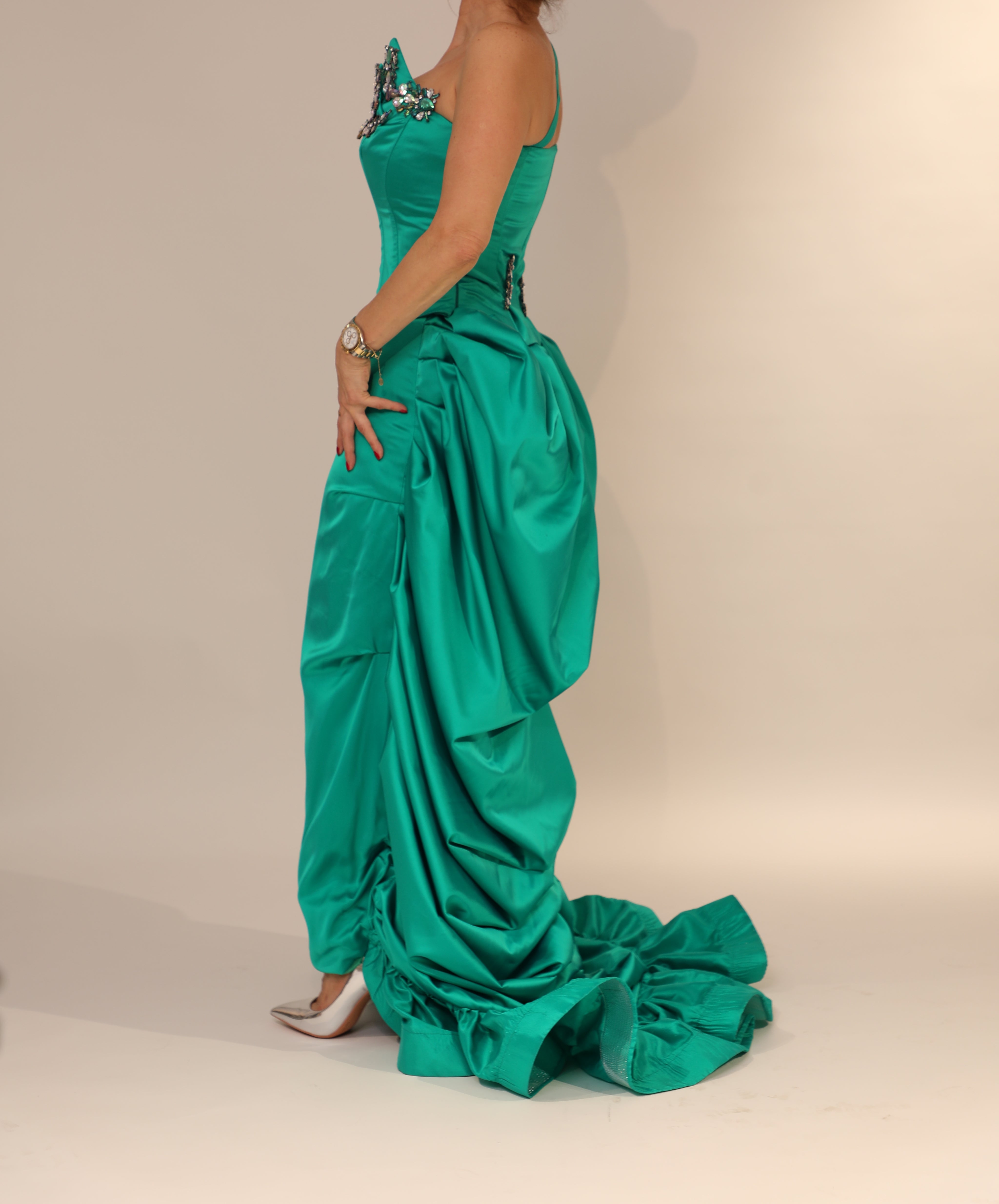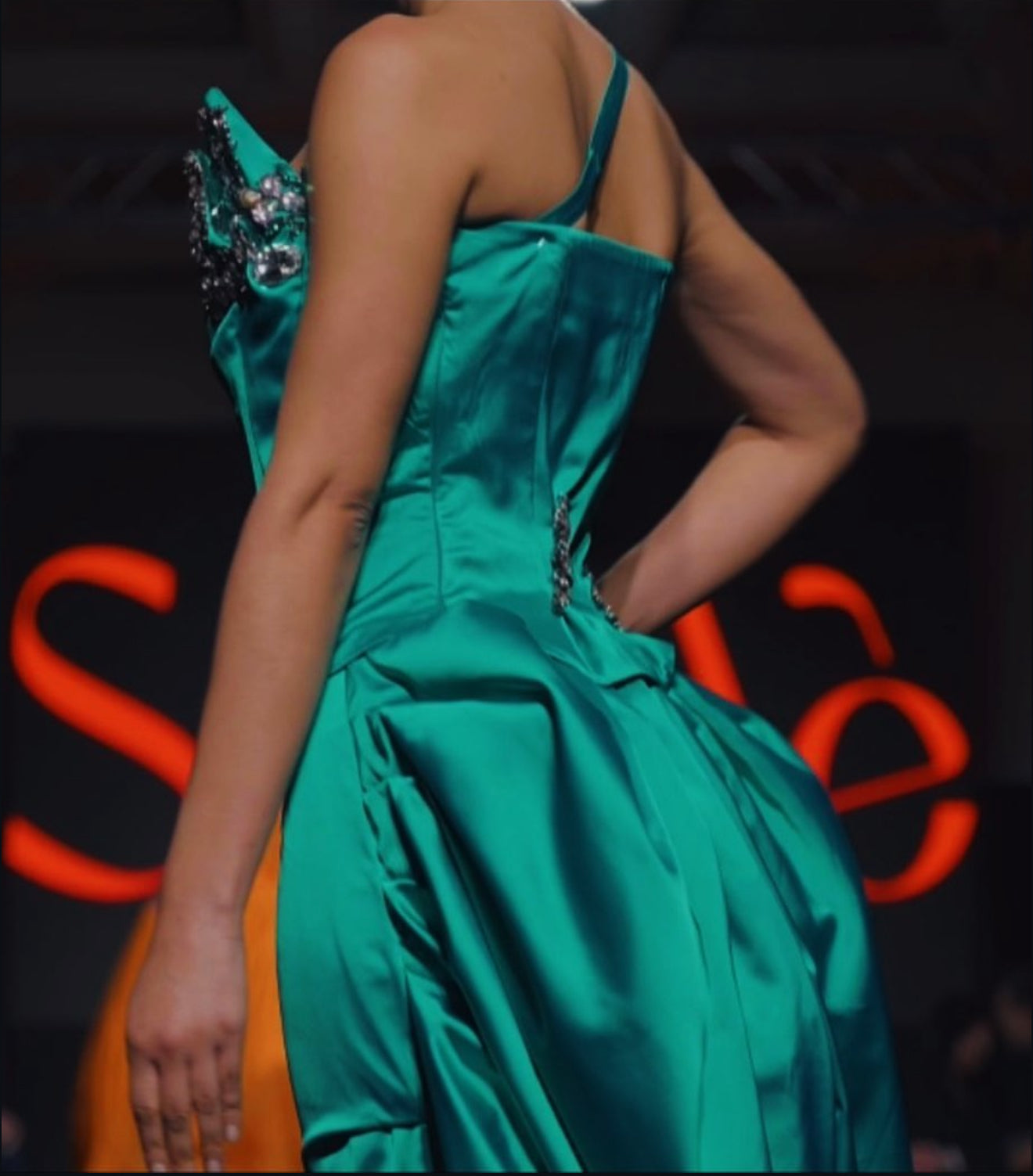 A unique turquoise two-piece dress scrunched from the sides to give an elevaed yet simple effect.