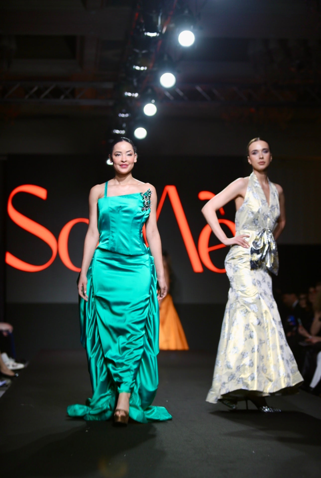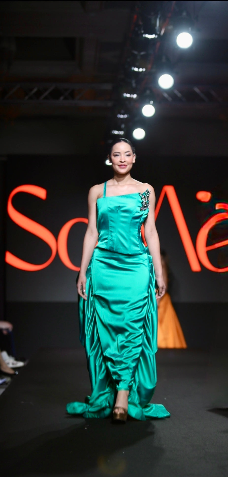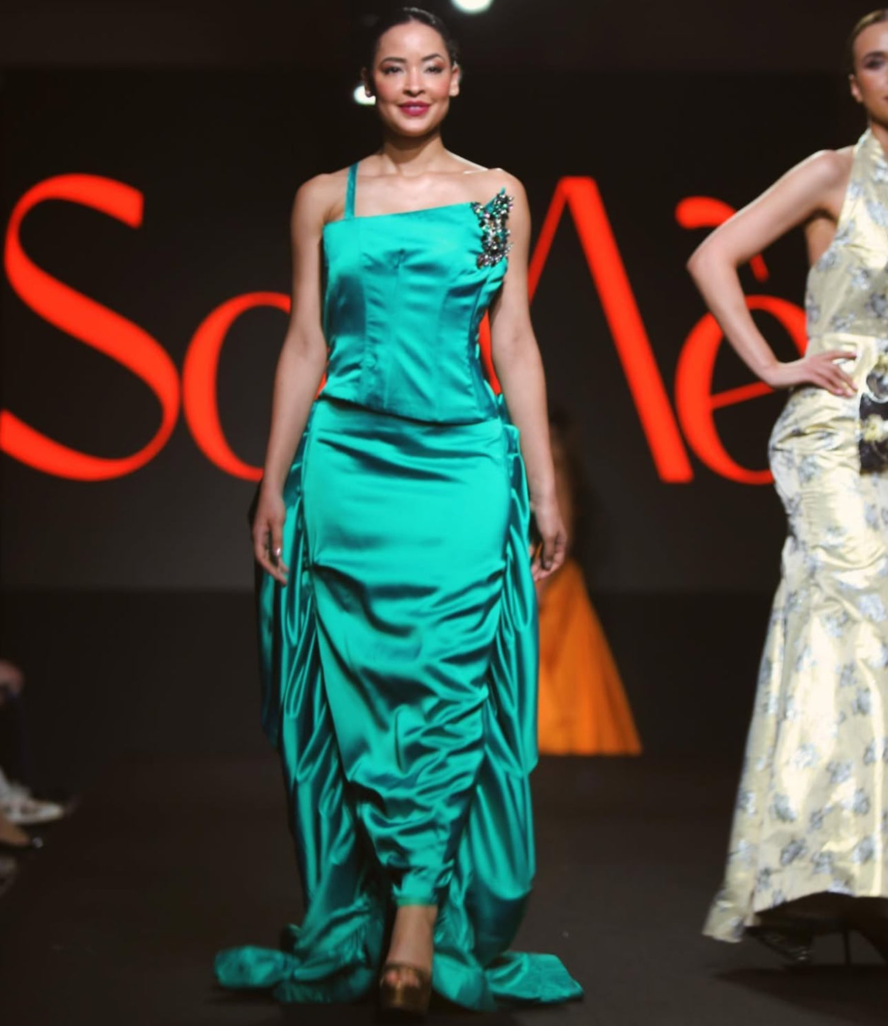 A unique turquoise two-piece dress scrunched from the sides to give an elevaed yet simple effect.